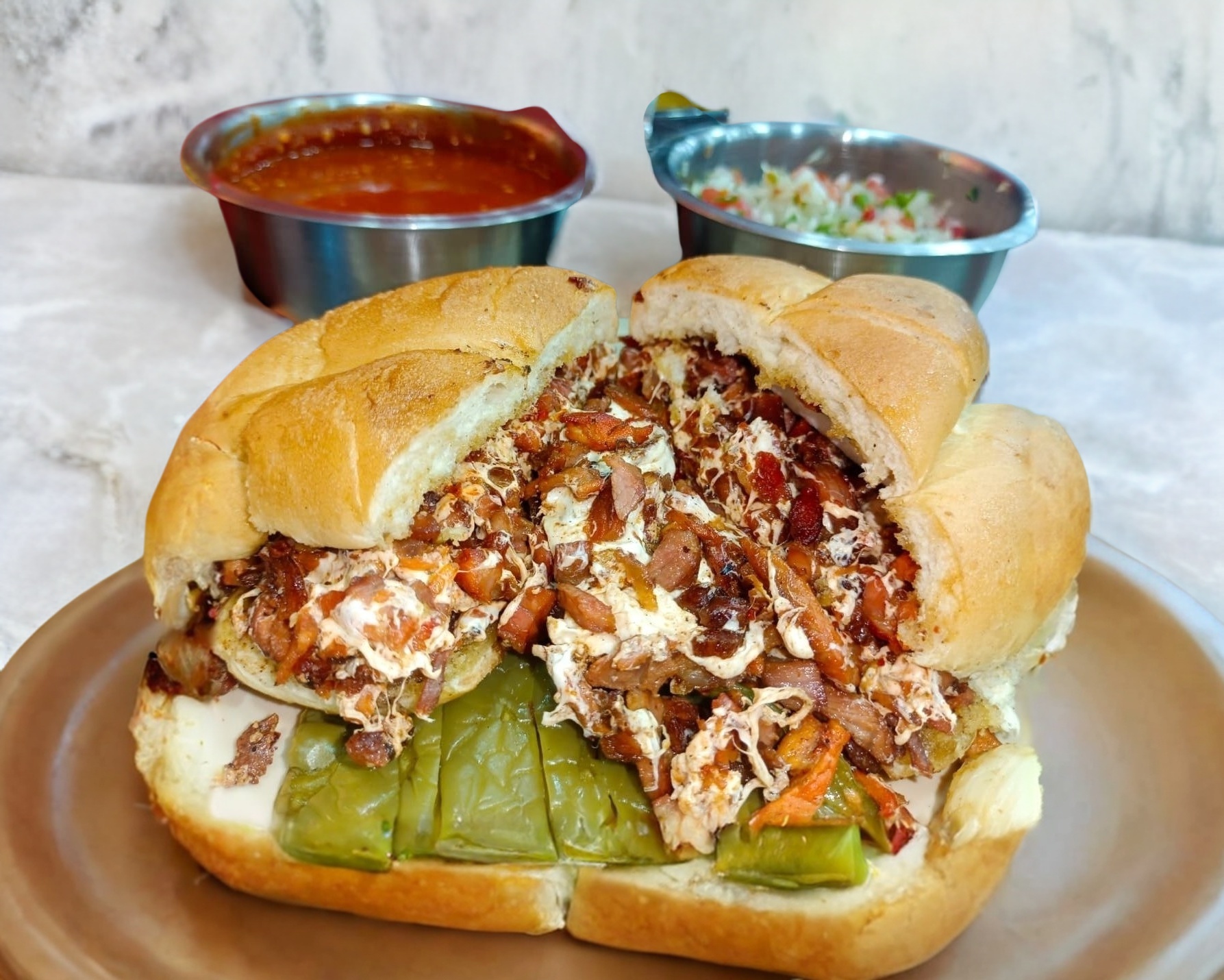 Telera rellena de porción generosa de carne al pastor.
