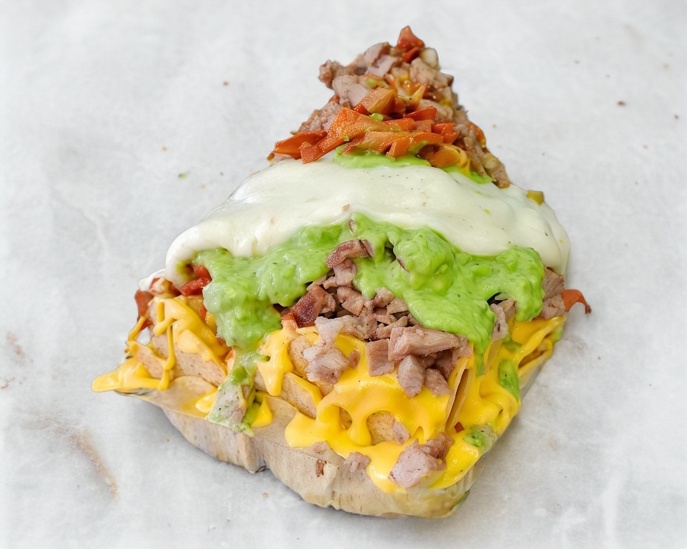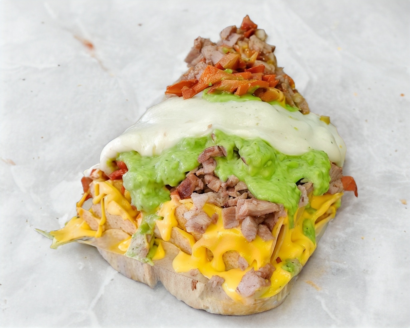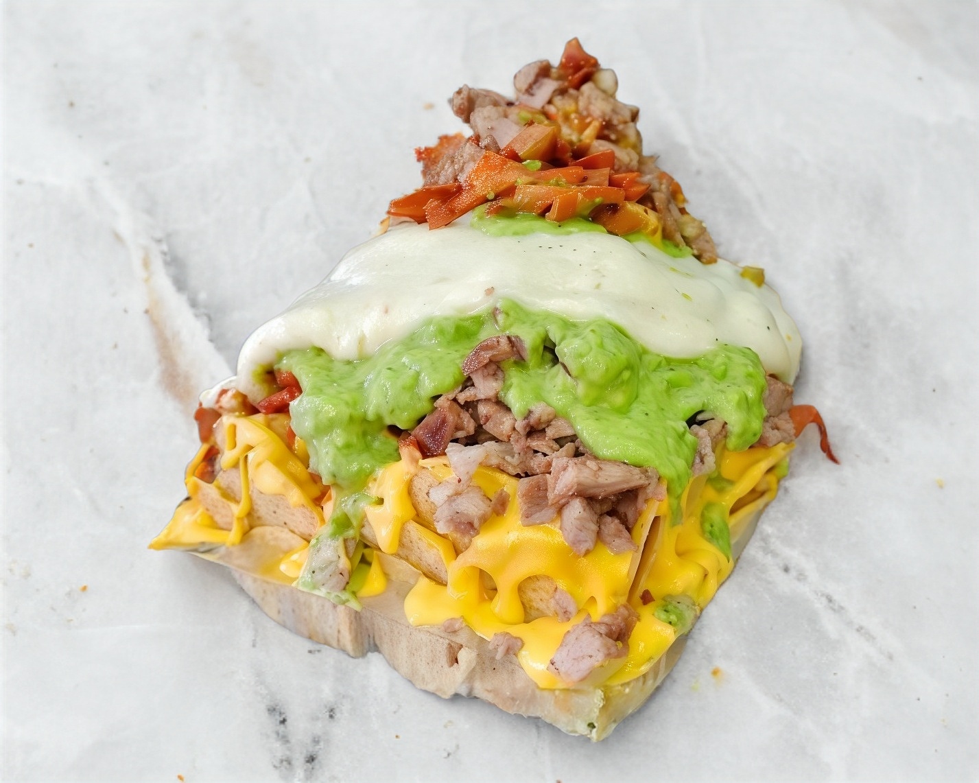Doradita cubierta de carne al pastor y quesillo.
