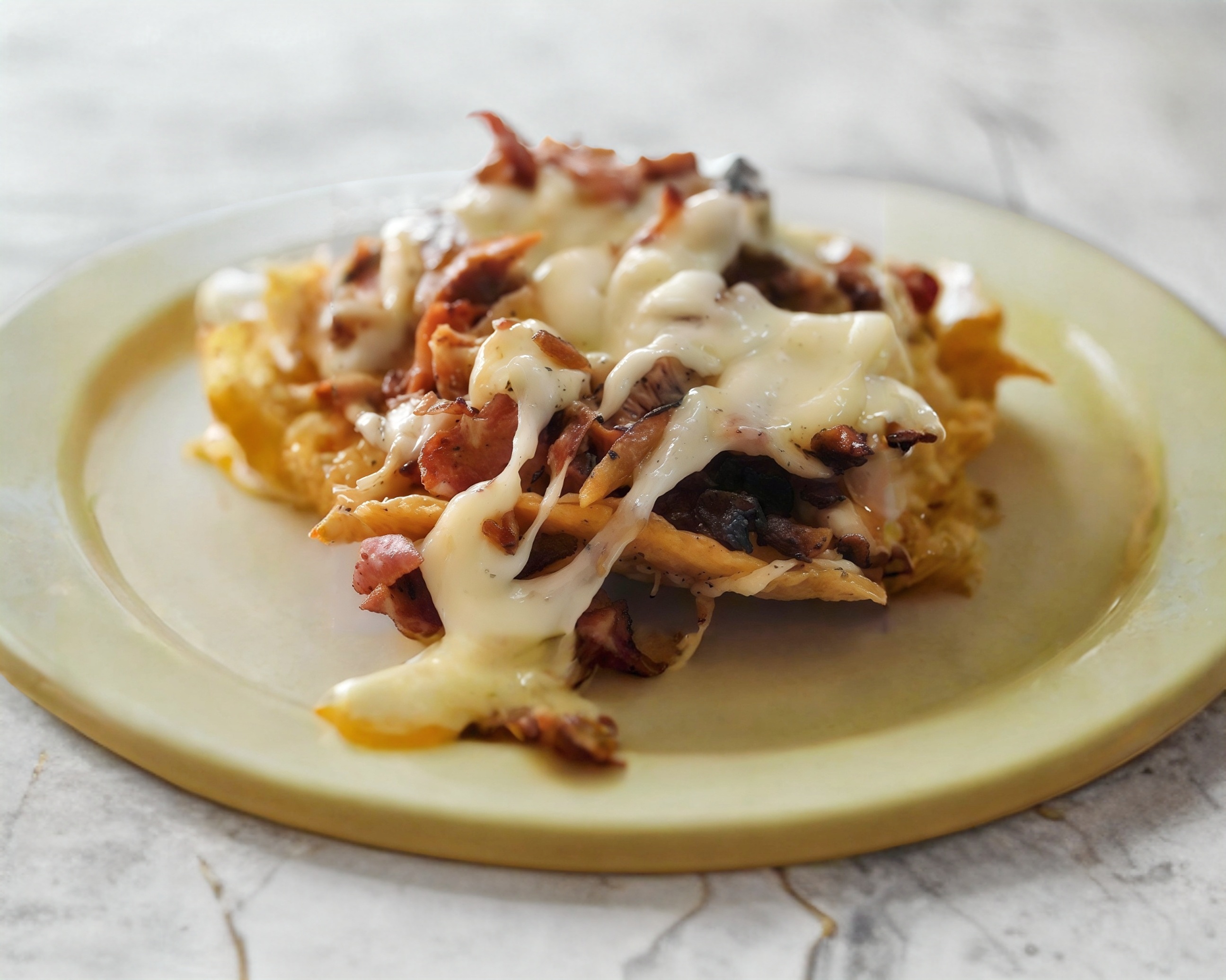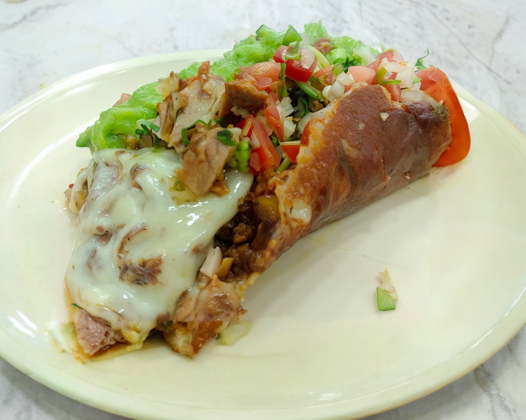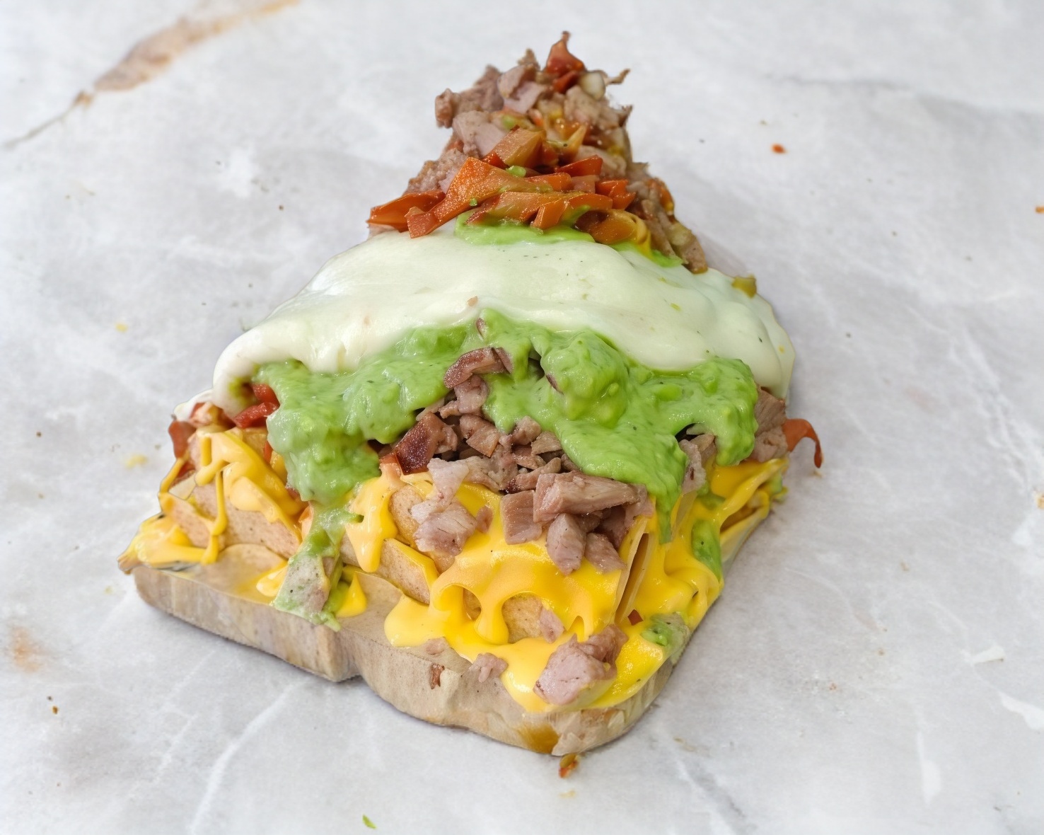 Doradita cubierta de carne al pastor y quesillo.