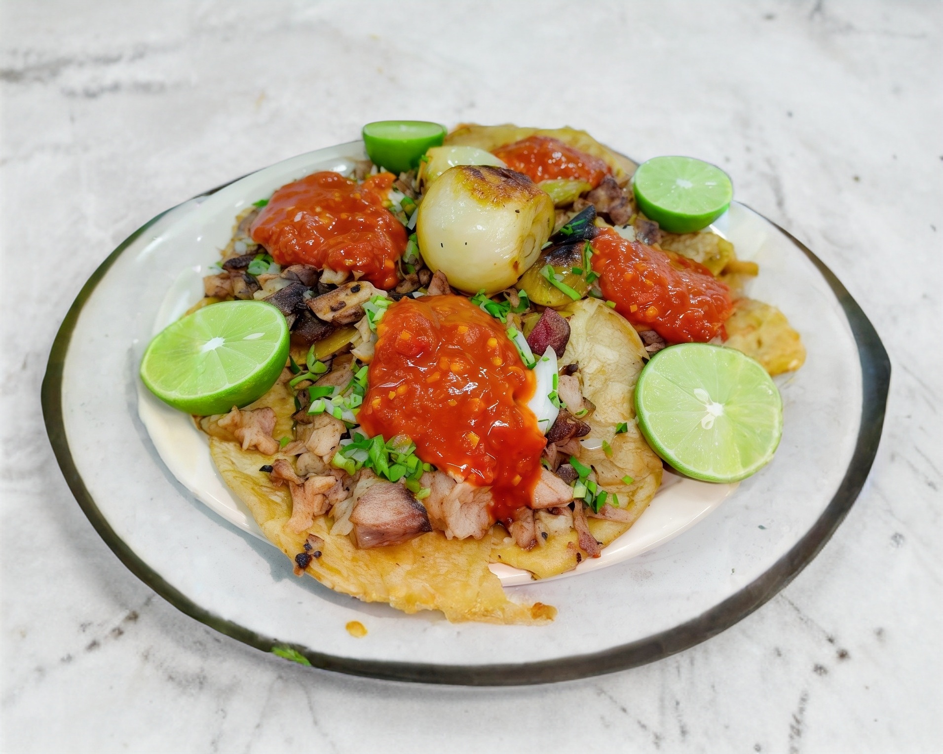 Taco de tortilla grande de suadero. de 80 gr apx con salsas y limones verduras como cebolla y cilantro
