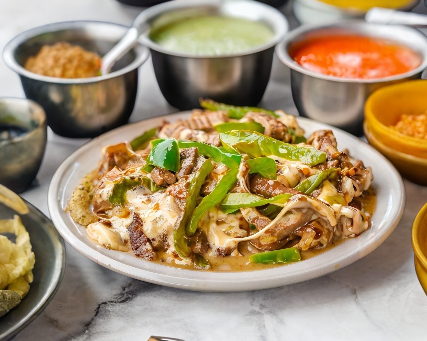 500 g De suadero con morrón cebolla gratinado acompañado de tortillas de harina.