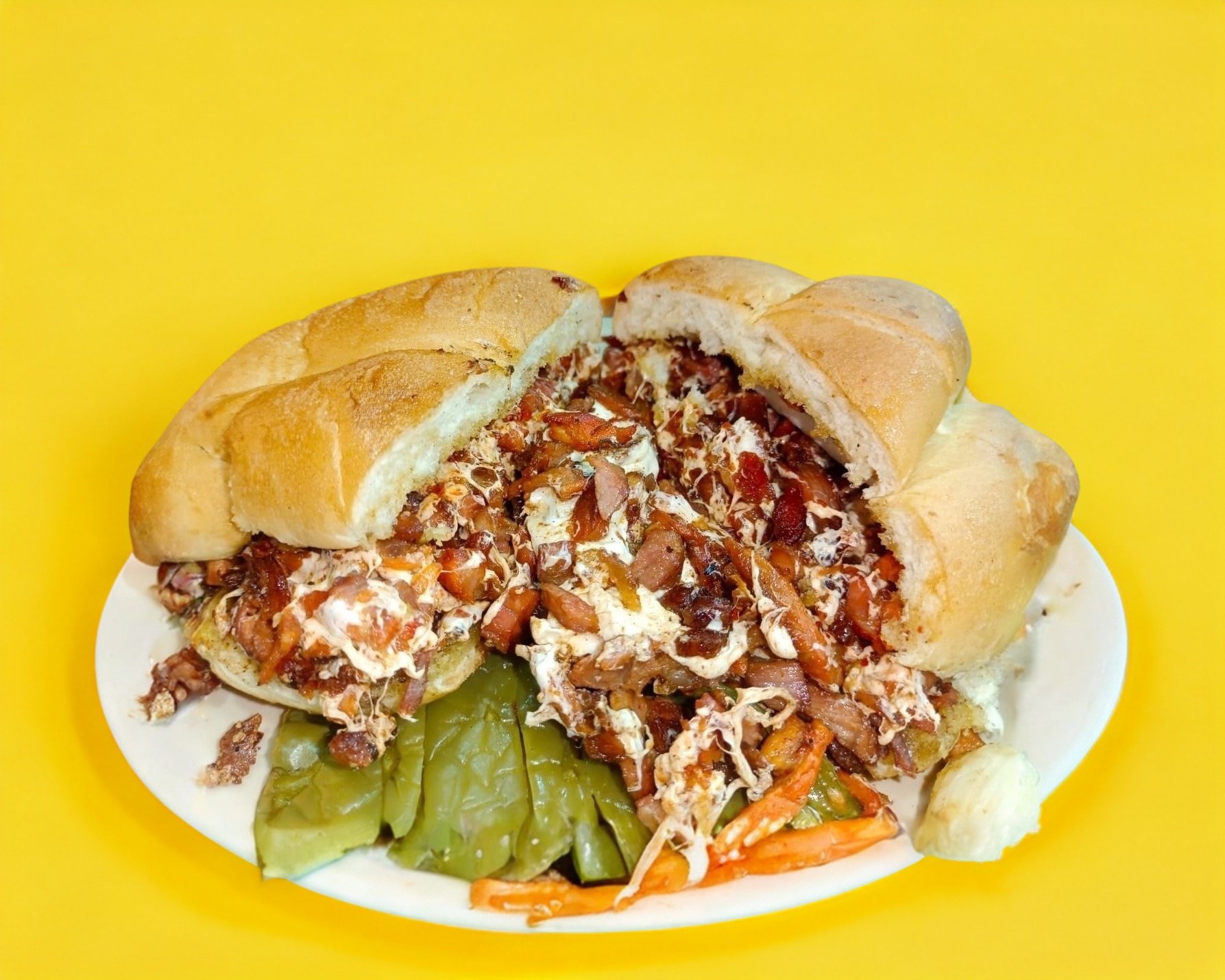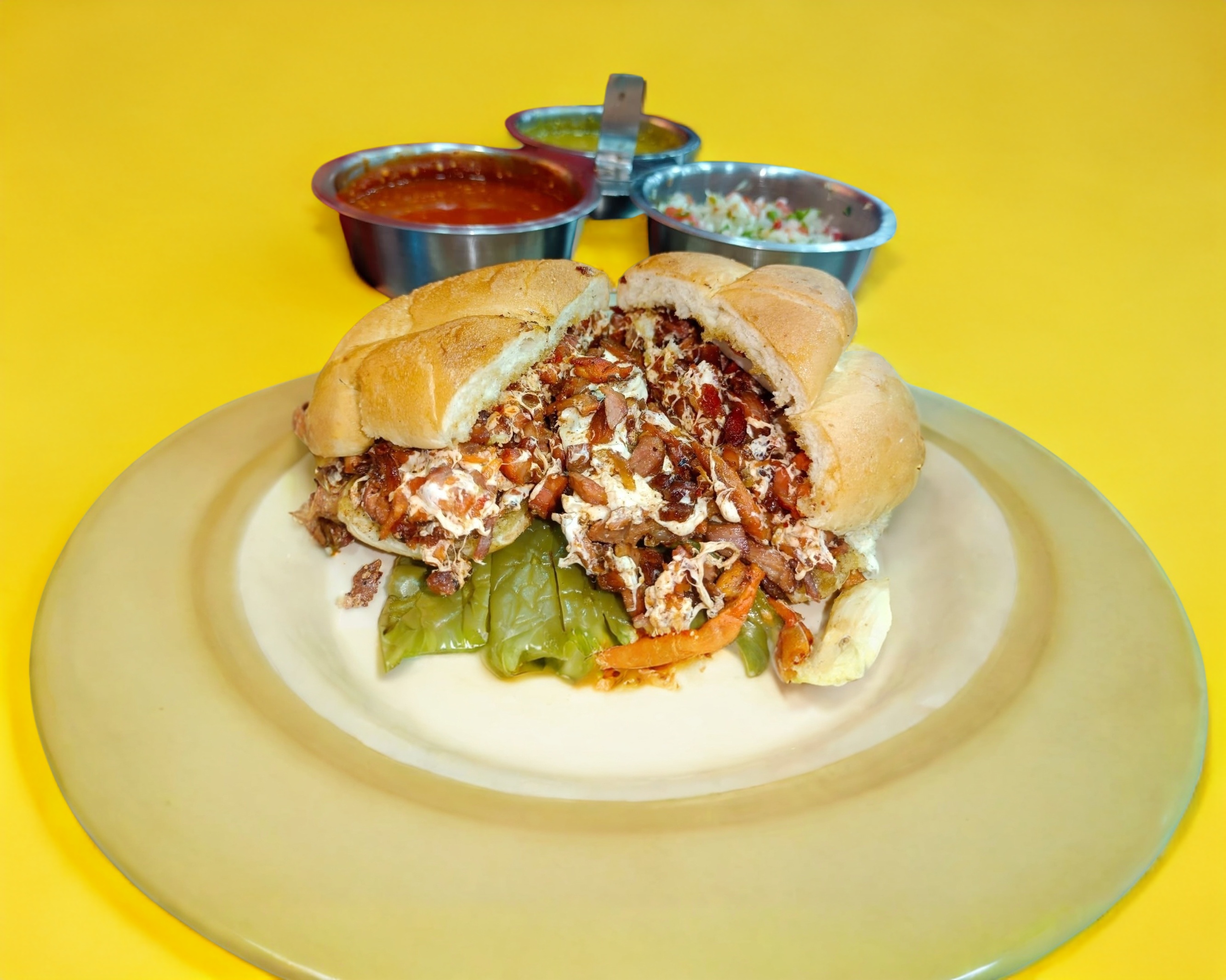 Telera rellena de porción generosa de carne al pastor con quesillo.