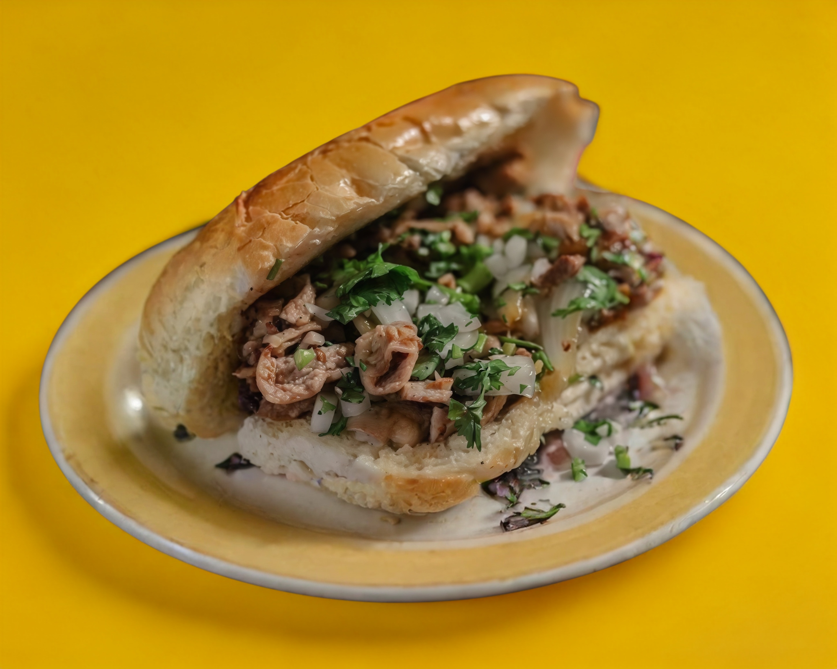 Telera rellena de porción generosa de longaniza y suadero con quesillo.