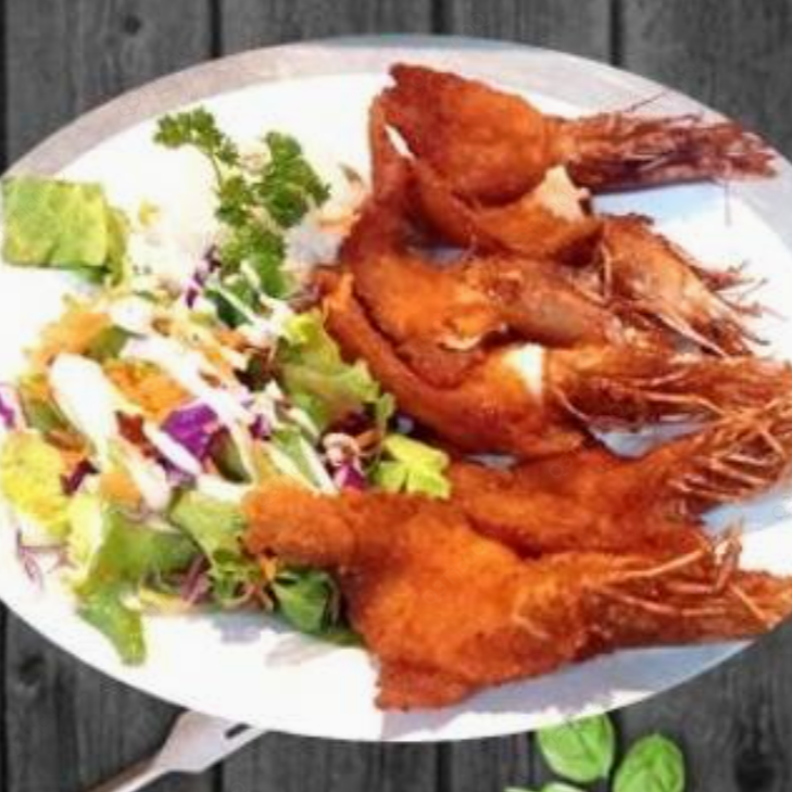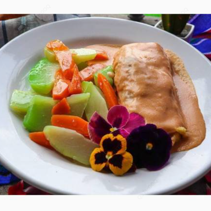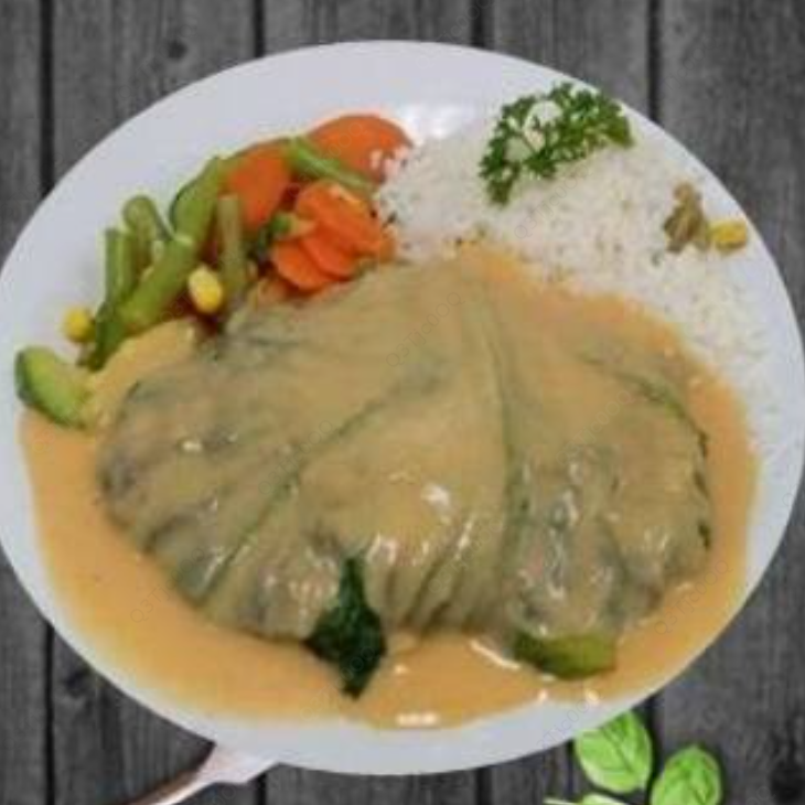 Relleno de camarón pacotilla con queso philadelphia, envuelto con lechuga bañado con crema de langostino, guarnición arroz y verduras.