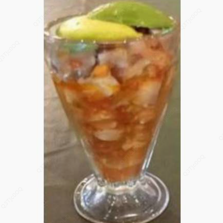 Coctel con camarón, ostión, cátsup, cebolla, cilantro, aguacate.