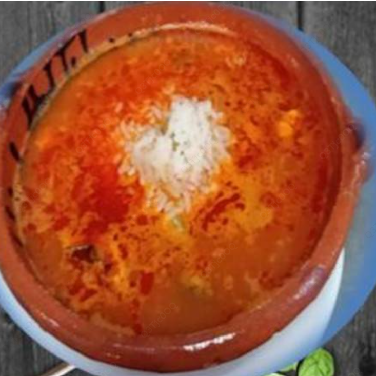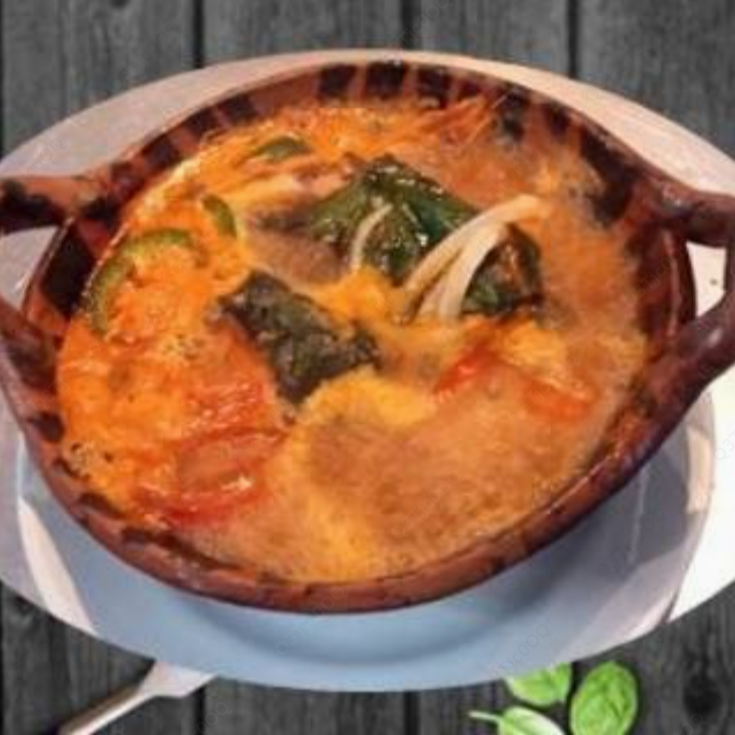 Caldo de pescado con anca de rana, lomo de robalo, lomo de mero, camarón, ostión ,jaiba, jitomate, cebolla, chile cuaresmeño, epazote, queso gratinado.