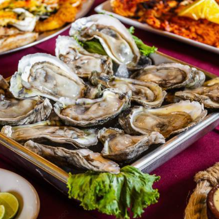 Camarón 500 g, filete de pescado 350 g, pulpo 215 g, anca de rana 180 g, ostiones rockefeller 12 pzas.
