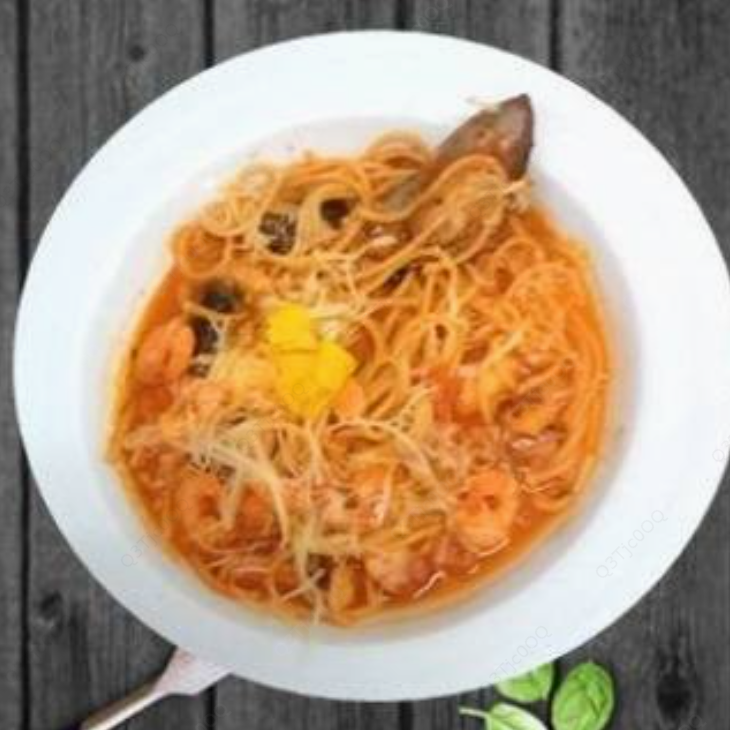 Spaghetti, camarón, pulpo, mejillón, salsa pomodoro.