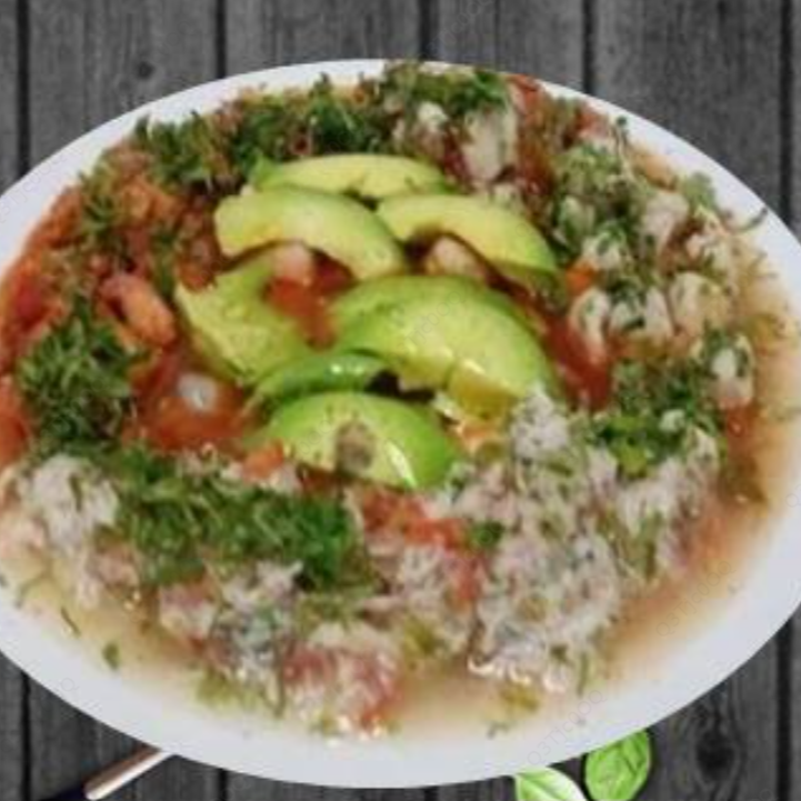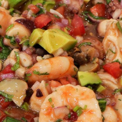 Ceviche de pulpo, jaiba, pescado, pulpo, ceviche de calamar, al centro camarón pacotilla con cátsup, cebolla, cilantro, aguacate.