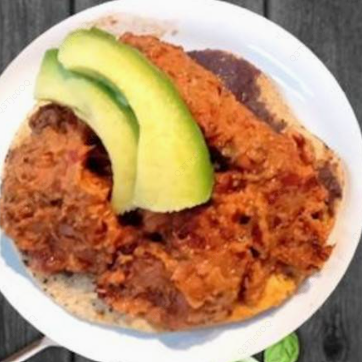 Tortilla de maíz, pescado ahumado guisado en salsa mexicana, queso manchego, frijoles.