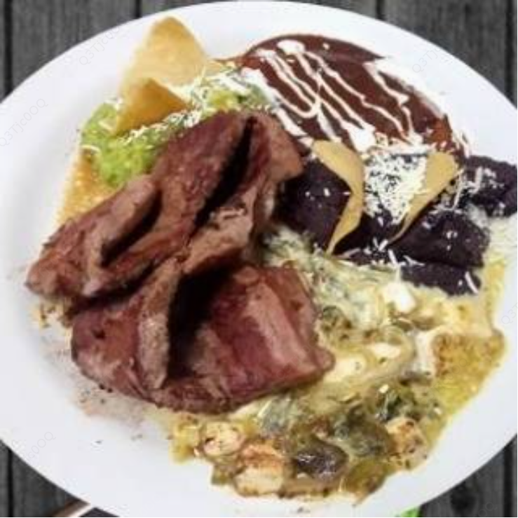 Filete de res, guacamole, rajas con crema, doblada de mole, frijoles refritos.