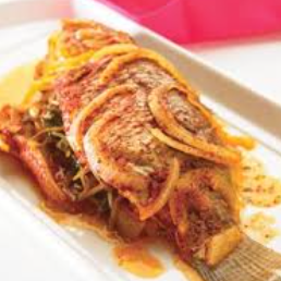 Pescado guisado con jitomate, frijoles y aguacate.