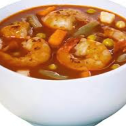 Caldo de camaron con pulpa de jaiba y verdura.