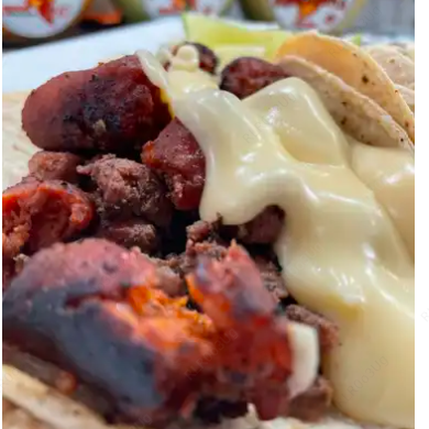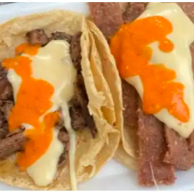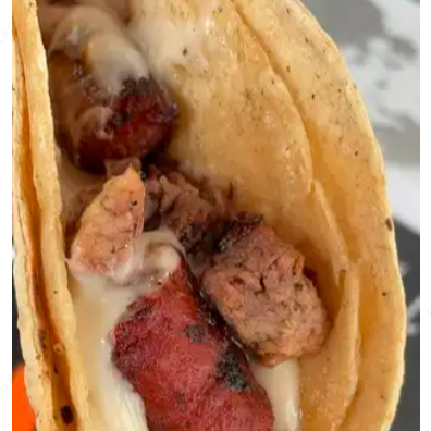 Taco especial de arrachera con chistorra bañado en nuestro único queso gouda.