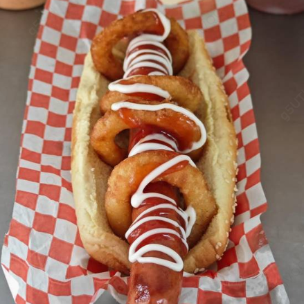 La versión más perrona de nuestro famoso perro del aro: hot dog de salchicha estilo polaca de 50 cm con cama de papatina crujiente y aros de cebolla.