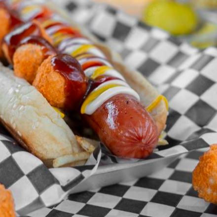 De 25 cm, hot dog de salchicha estilo polaca de 25 cm con cama de papatina crujiente con palomitas de pollo.