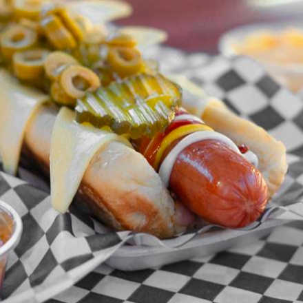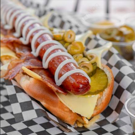 De 25 cm, hot dog de salchicha estilo polaca de 25 cm con cama de papatina crujiente con queso, tocino, pepinillos y aceitunas.