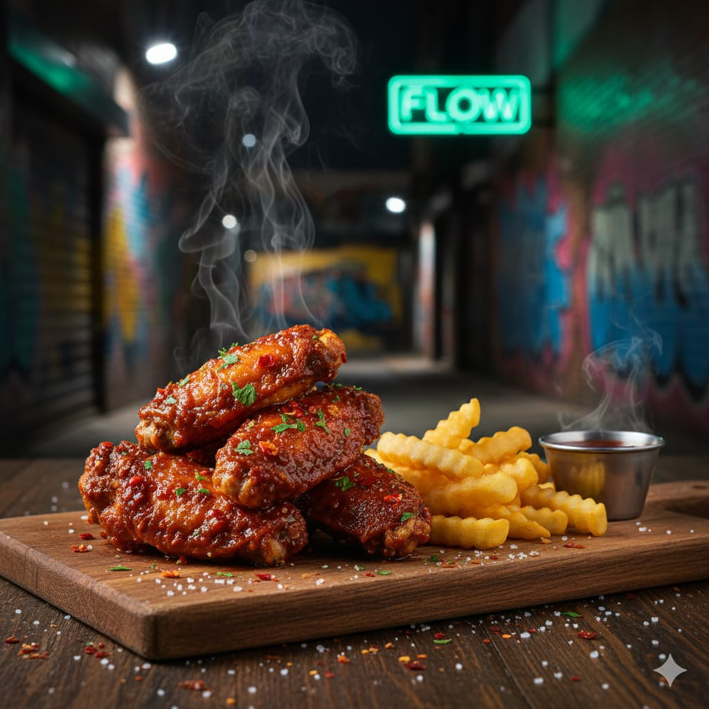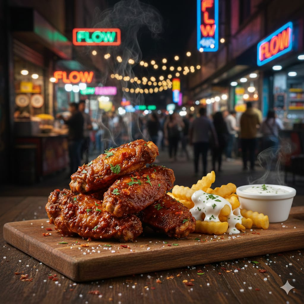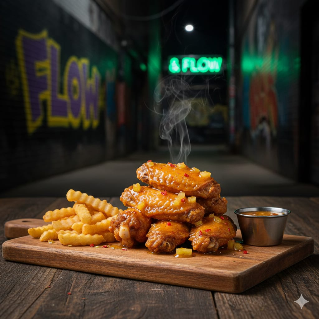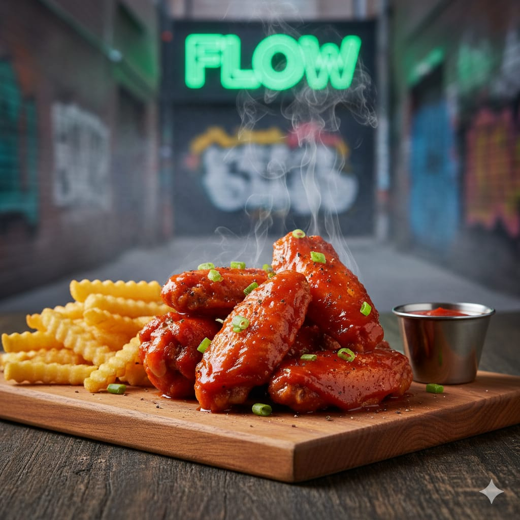 6 ALITAS EN TU SALSA FAVORITA CON 100 GRAMOS DE PAPAS A LA FRANCESA Y ADEREZO RANCH
