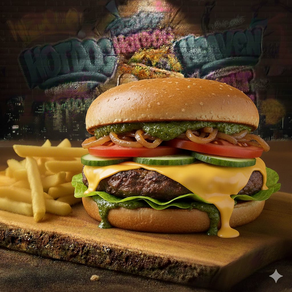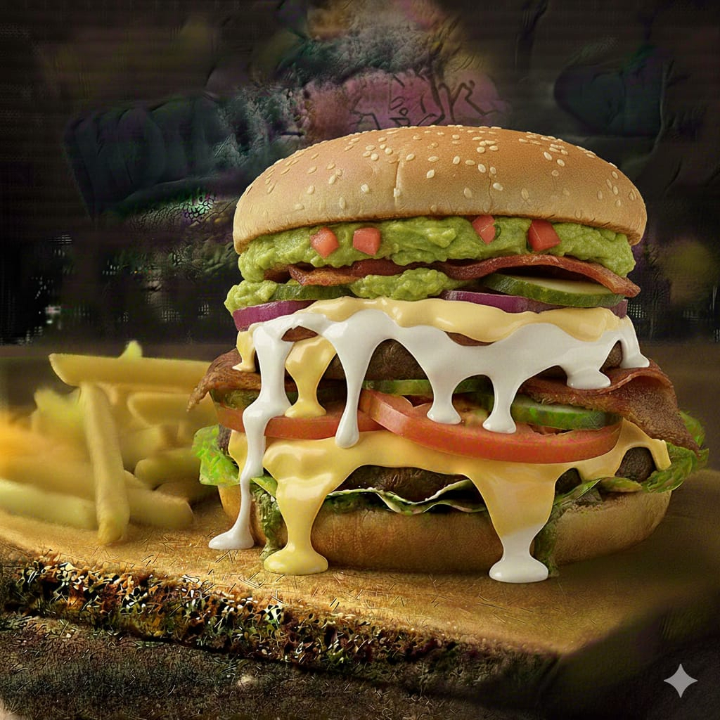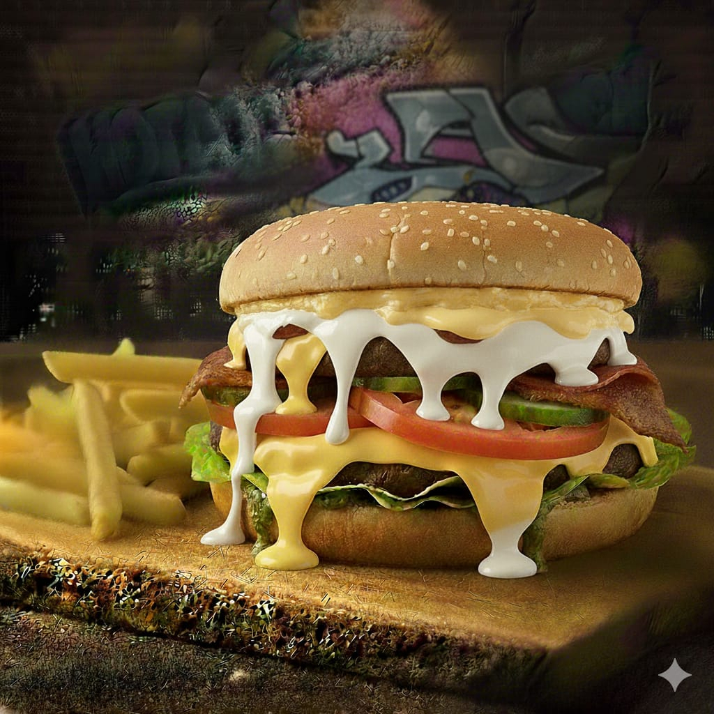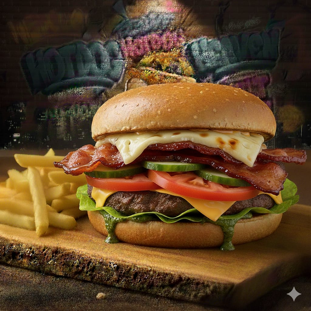 Carne jugosa con tocino y aderezo gratinado con un toque a miel de maple y tocino ,Mix de Queso Fundido ,Queso Americano ,Jitomate ,Pepino ,Cebollas Caramelizadas y Chimichurry acompañado de 100 gramos de Papas a la Francesa