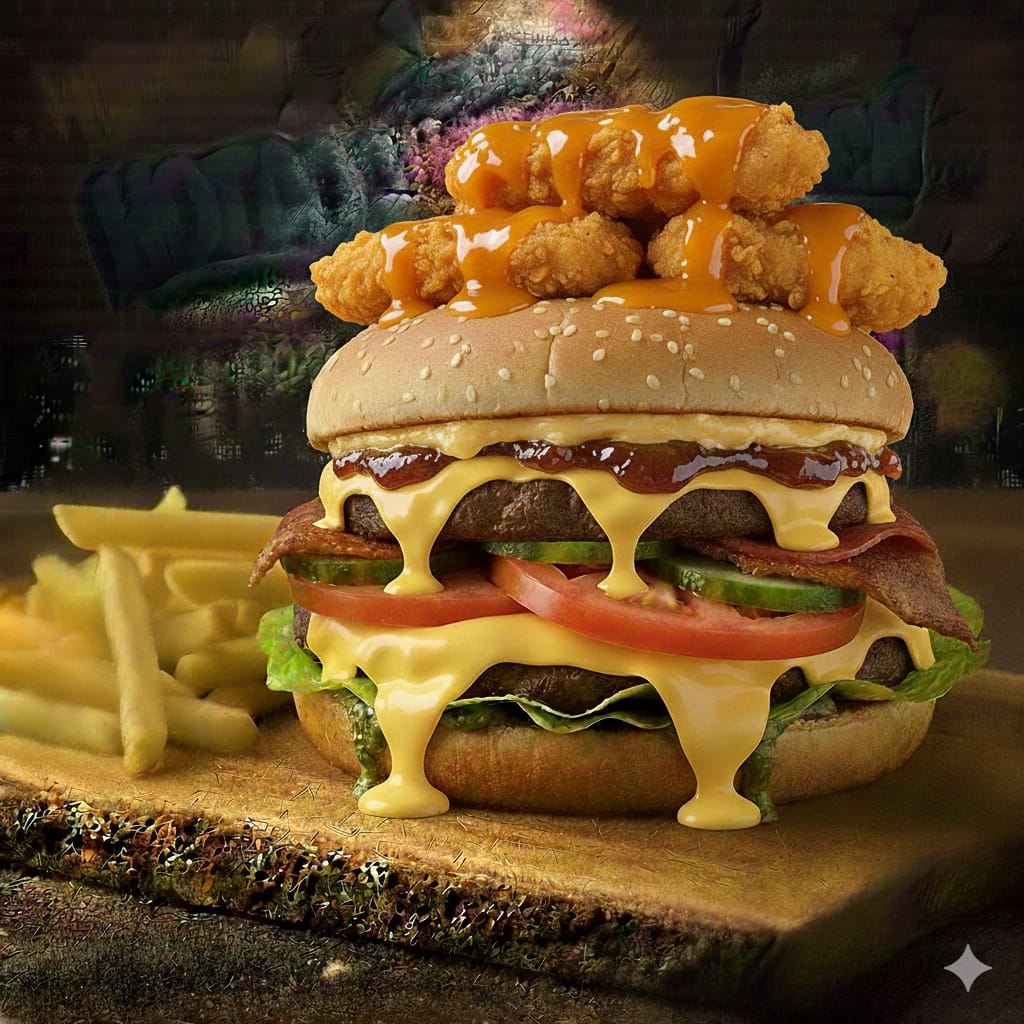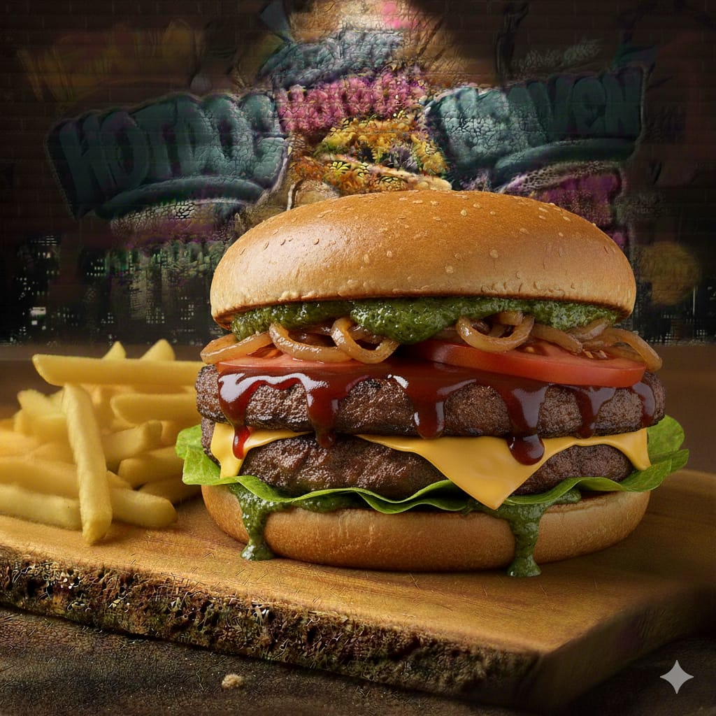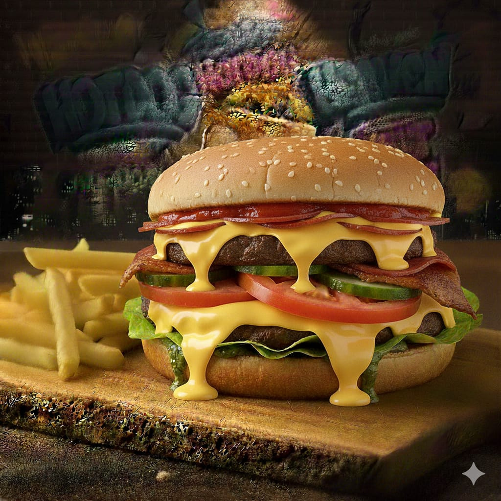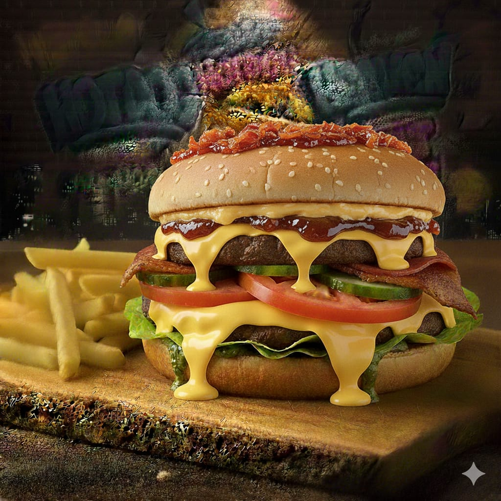 Carne jugosa con tocino y aderezo gratinado con un toque a miel de maple y tocino ,Mix de Queso Fundido ,Queso Americano ,Jitomate ,Pepino ,Cebollas Caramelizadas y Chimichurry acompañado de 100 gramos de Papas a la Francesa