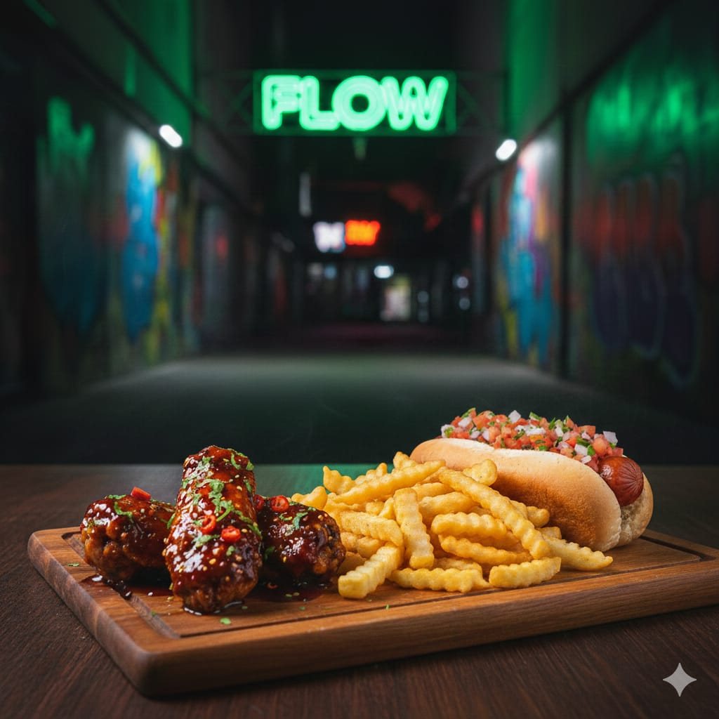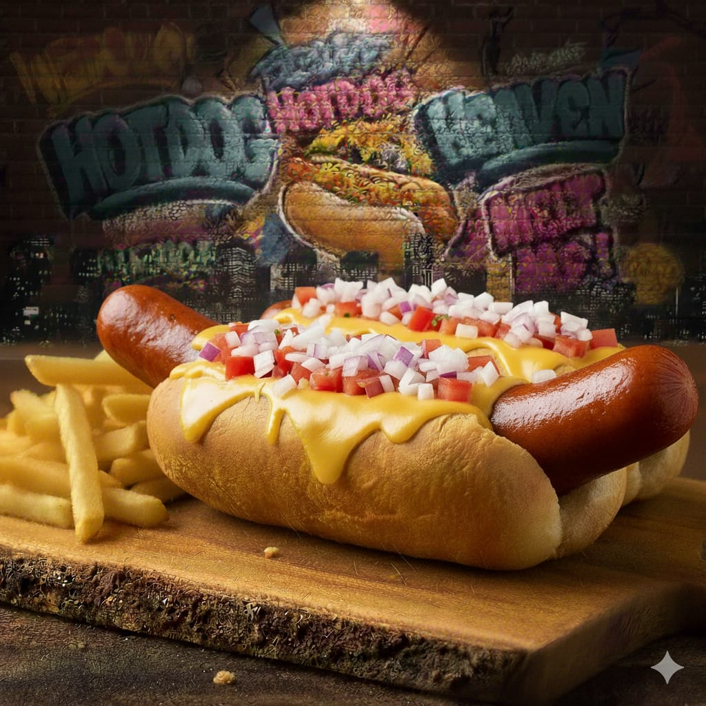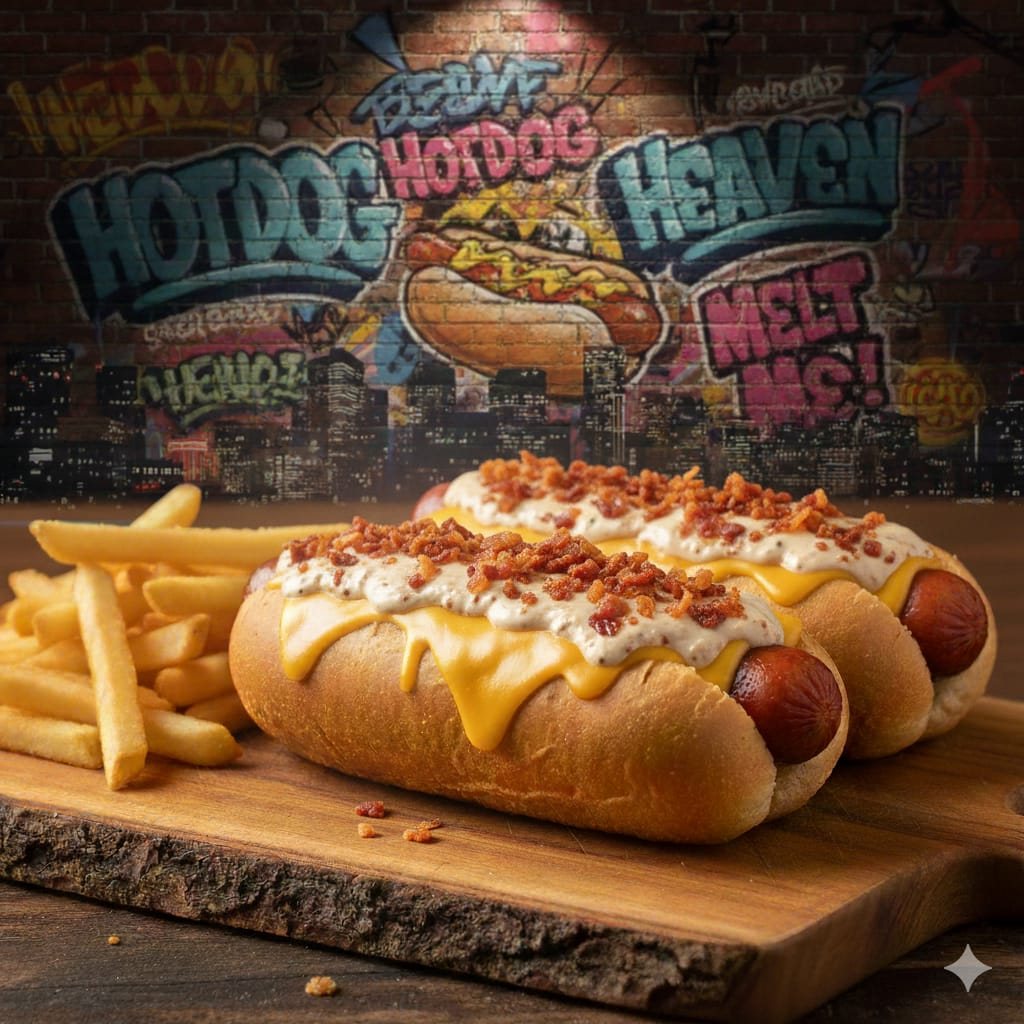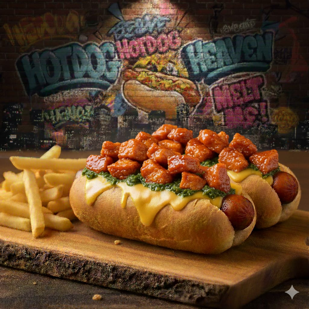 2 Hotdogs con Boneless banados en salsa de Mango Habanero y un toque de BBQ ,Mix de Queso Fundido ,Queso Americano Fundido ,Jitomate ,Pepino ,Cebollas Caramelizadas y Chimichurry acompañado de 100 gramos de Papas a la Francesa