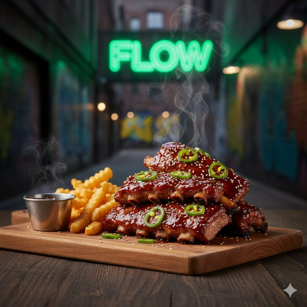 Deliciosas Costillas de cerdo cubiertas con SALSA MANGO HABANERO acompanadas de 100 gramos de papas a la francesa