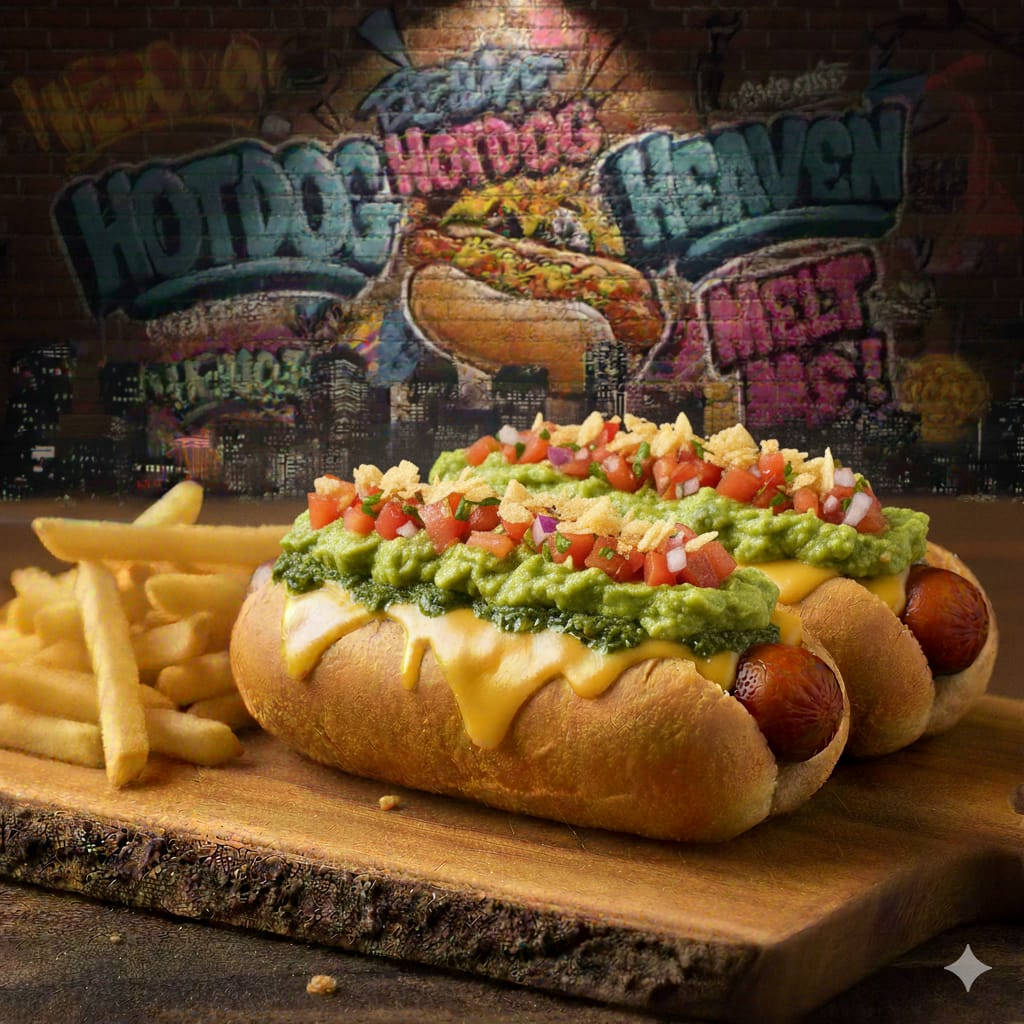 2 Hotdogs con Guacamole y Pico de Gallo ,Chips de Papas ,Mix de Queso Fundido ,Queso Americano Fundido ,Jitomate ,Pepino ,Cebollas Caramelizadas y Chimichurry acompañado de 100 gramos de Papas a la Francesa