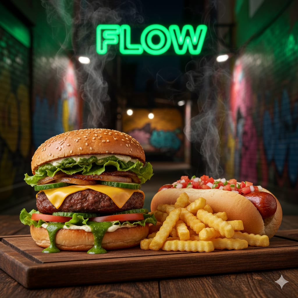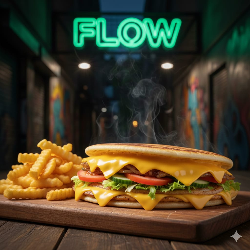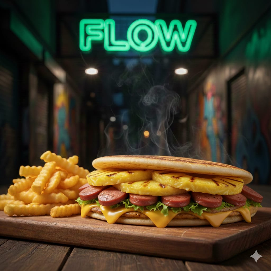 Carne jugosa con tenders banados en salsa de mango habanero ,Mix de Queso Fundido ,Queso Americano ,Jitomate ,Pepino ,Cebollas Caramelizadas y Chimichurry acompañado de 100 gramos de Papas a la Francesa