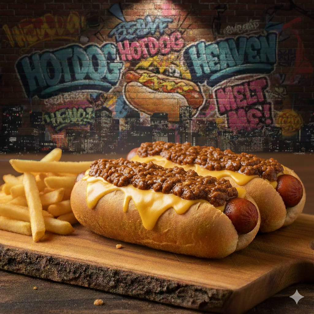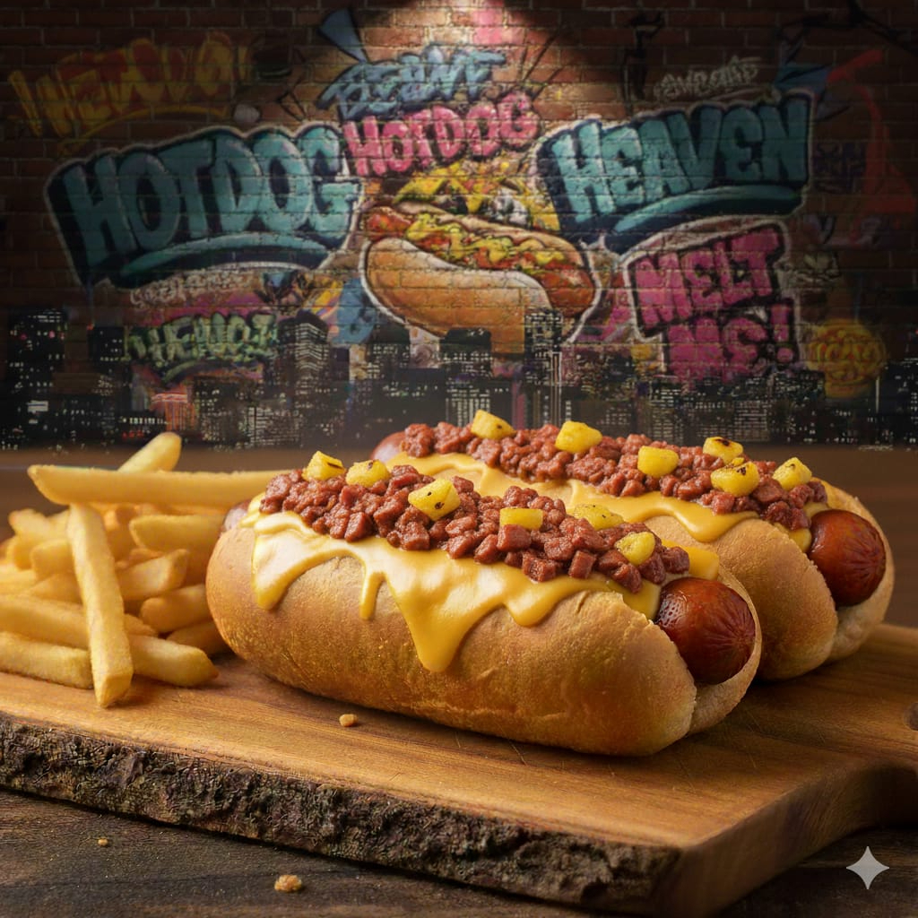 2 Hotdogs con Chilli con Carne ,Mix de Queso Fundido ,Queso Americano Fundido ,Jitomate ,Pepino ,Cebollas Caramelizadas y Chimichurry acompañado de 100 gramos de Papas a la Francesa