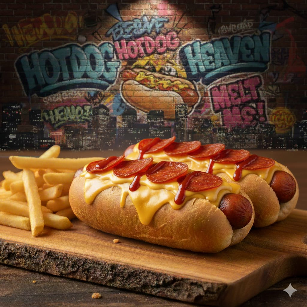 2 Hotdogs con Peperoni Salsa de Tomate ,Mix de Queso ,Queso Americano Fundido ,Jitomate ,Pepino ,Cebollas Caramelizadas y Chimichurry acompañado de 100 gramos de Papas a la Francesa