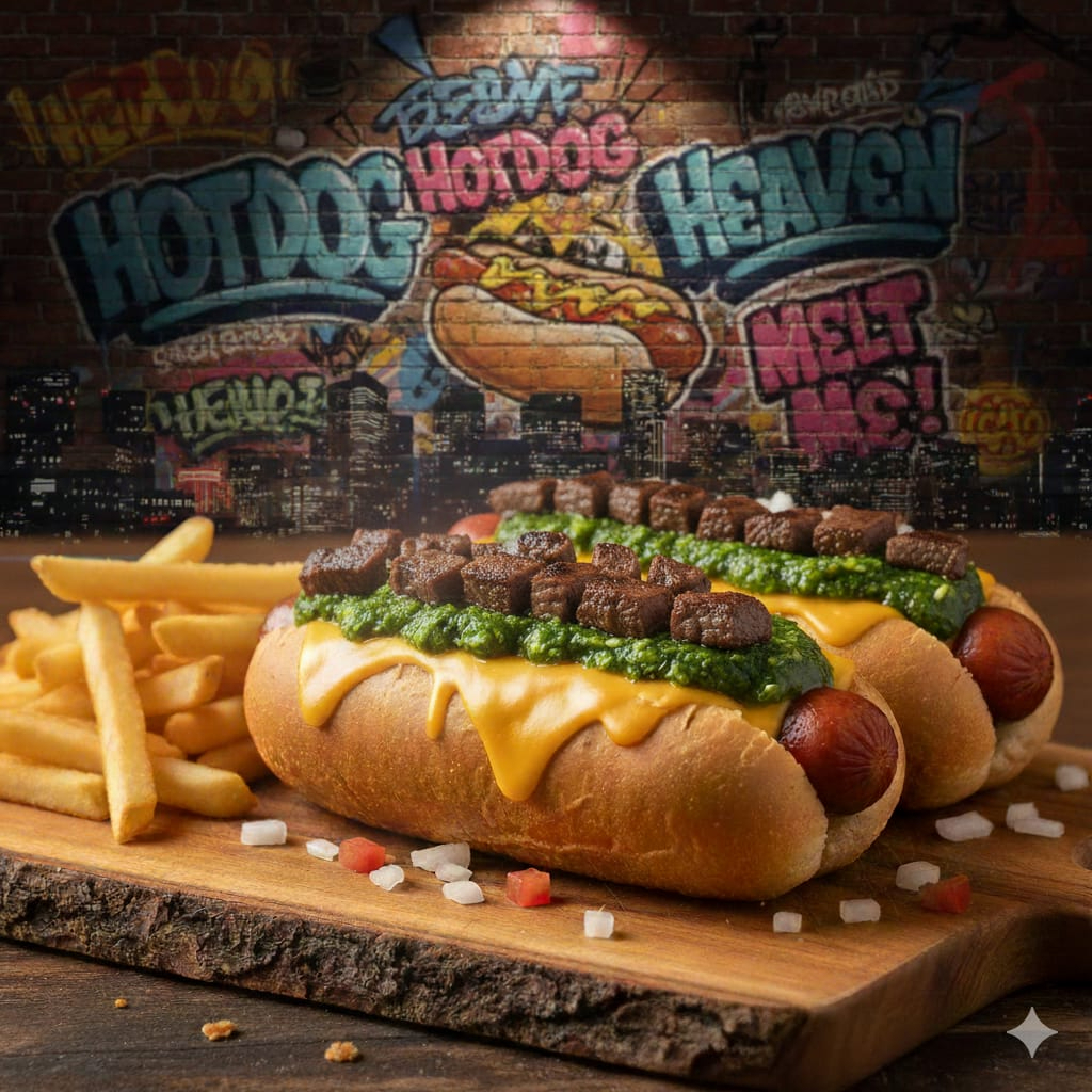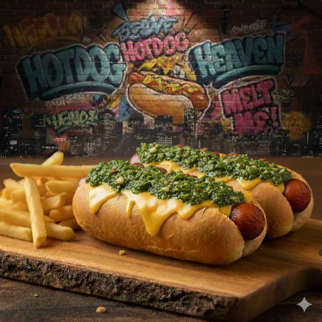 2 Hotdogs con Trozos de Chorizo Argentino a la plancha ,Mix de Queso Fundido ,Queso Americano Fundido ,Jitomate ,Pepino ,Cebollas Caramelizadas y Chimichurry acompañado de 100 gramos de Papas a la Francesa