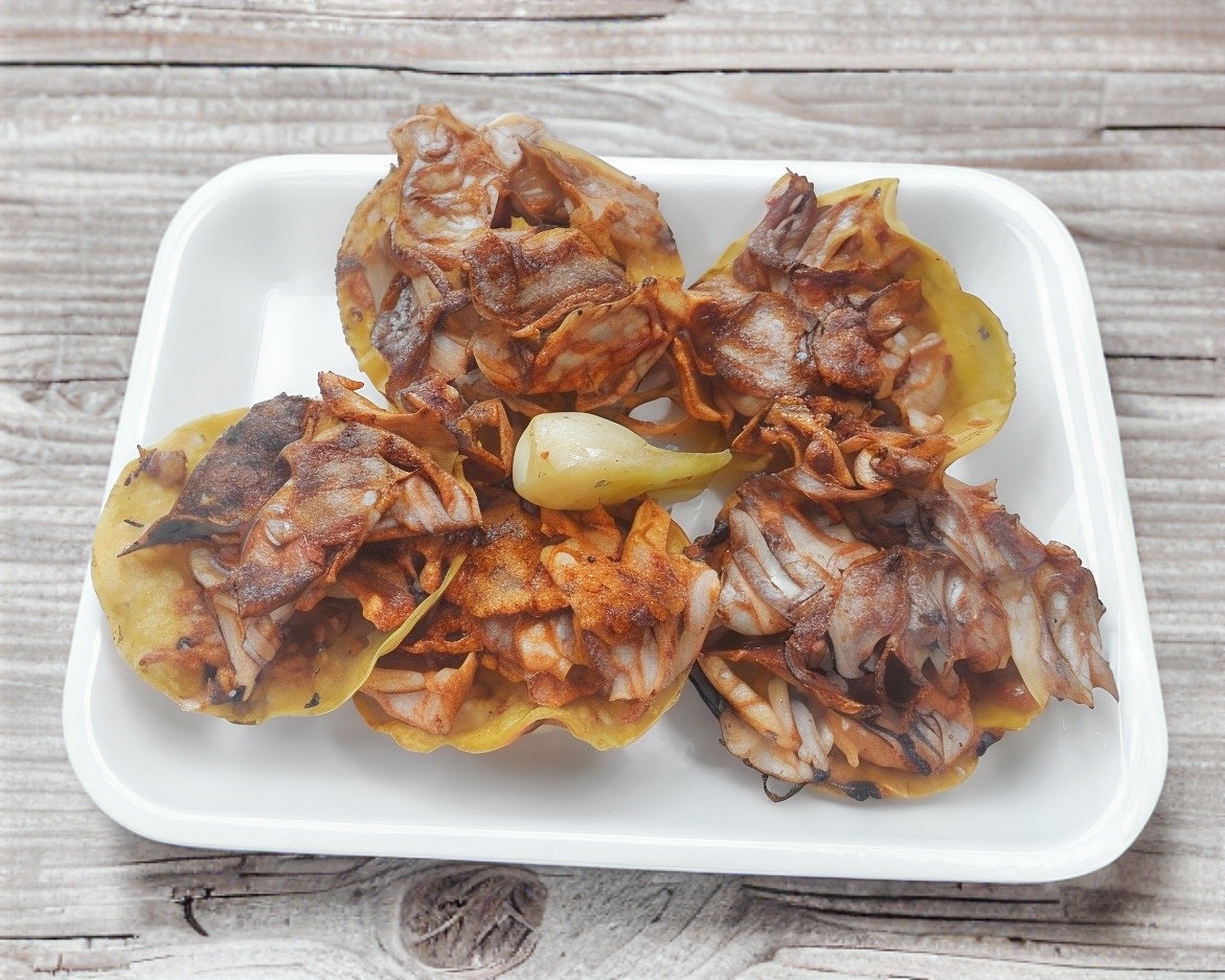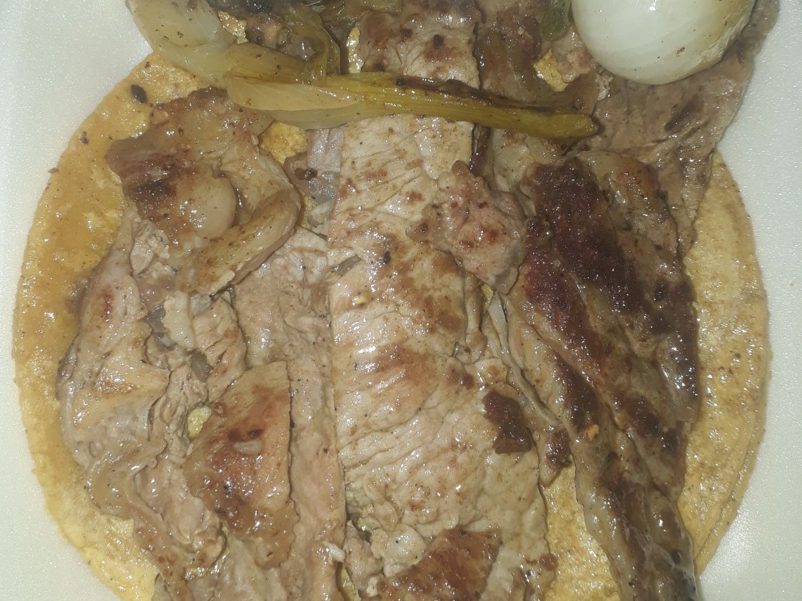 Pechuga finamente asada en tortilla de maíz o harina acompañado por separado de nuestros complementos (cebolla, cilantro, salsa, papas, pepinos y nopales
