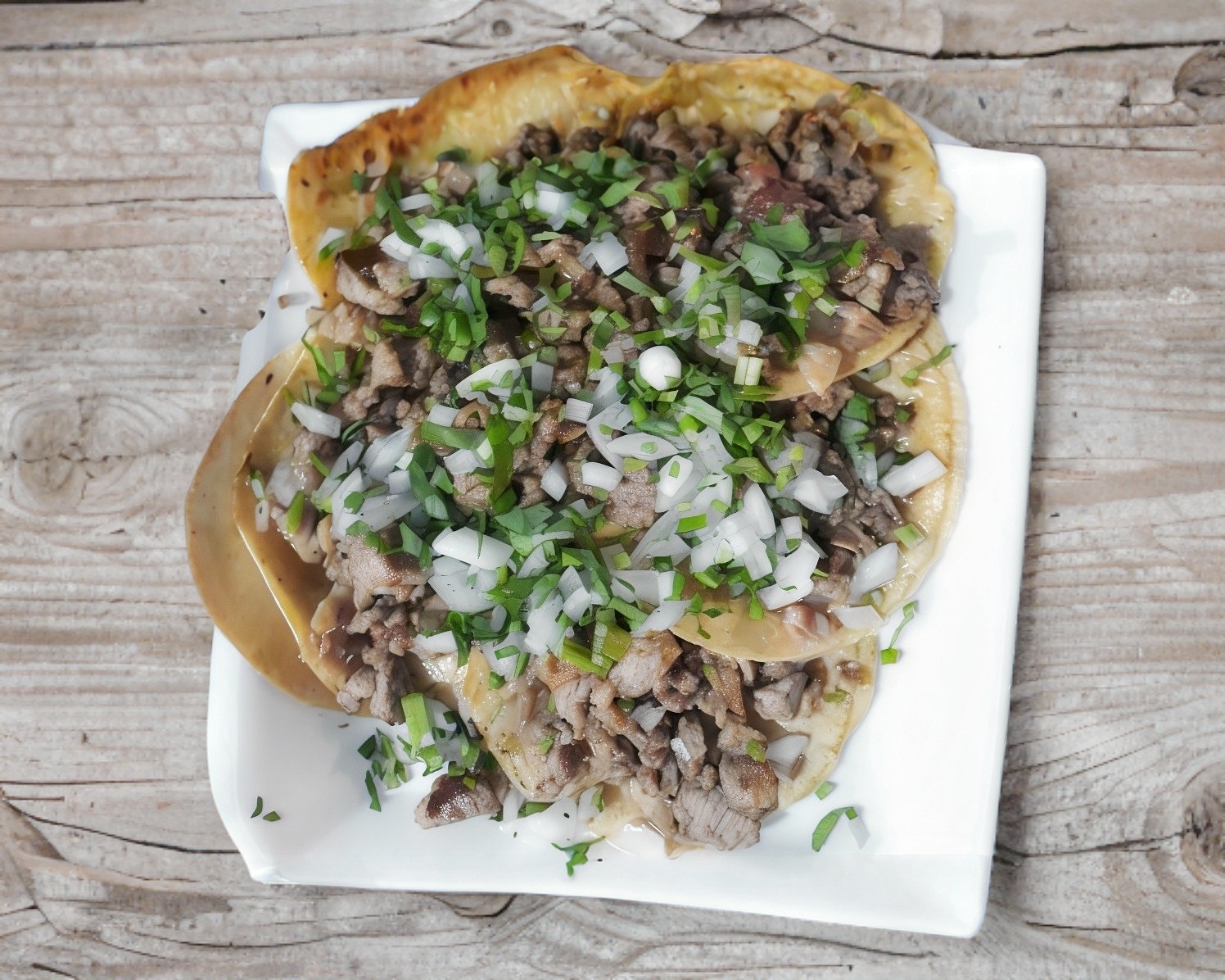 Cualquiera de nuestras exquisitas carnes en tortilla de harina doble (como sincronizada) con queso oaxaca fundido, acompañada por separado de nuestros complementos (cebolla, cilantro, salsa, papas, pepinos, nopales y cebollitas cambray).