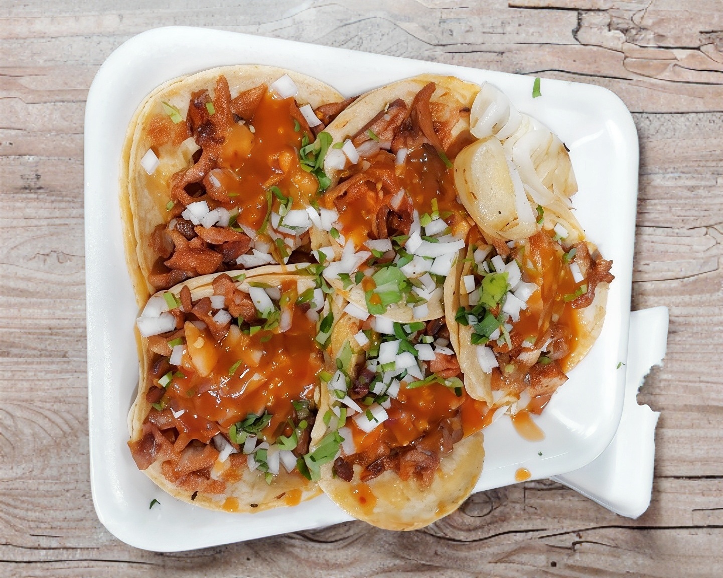 Delicioso Taco con la carne de tu elección(suadero, pastor, longaniza, campechano, tripa, bistec, pechuga, chuleta ahumada) en tortilla de maíz o harina; acompañado por separado de nuestros complementos (cebolla, cilantro, salsa, papas, pepinos y nopales).