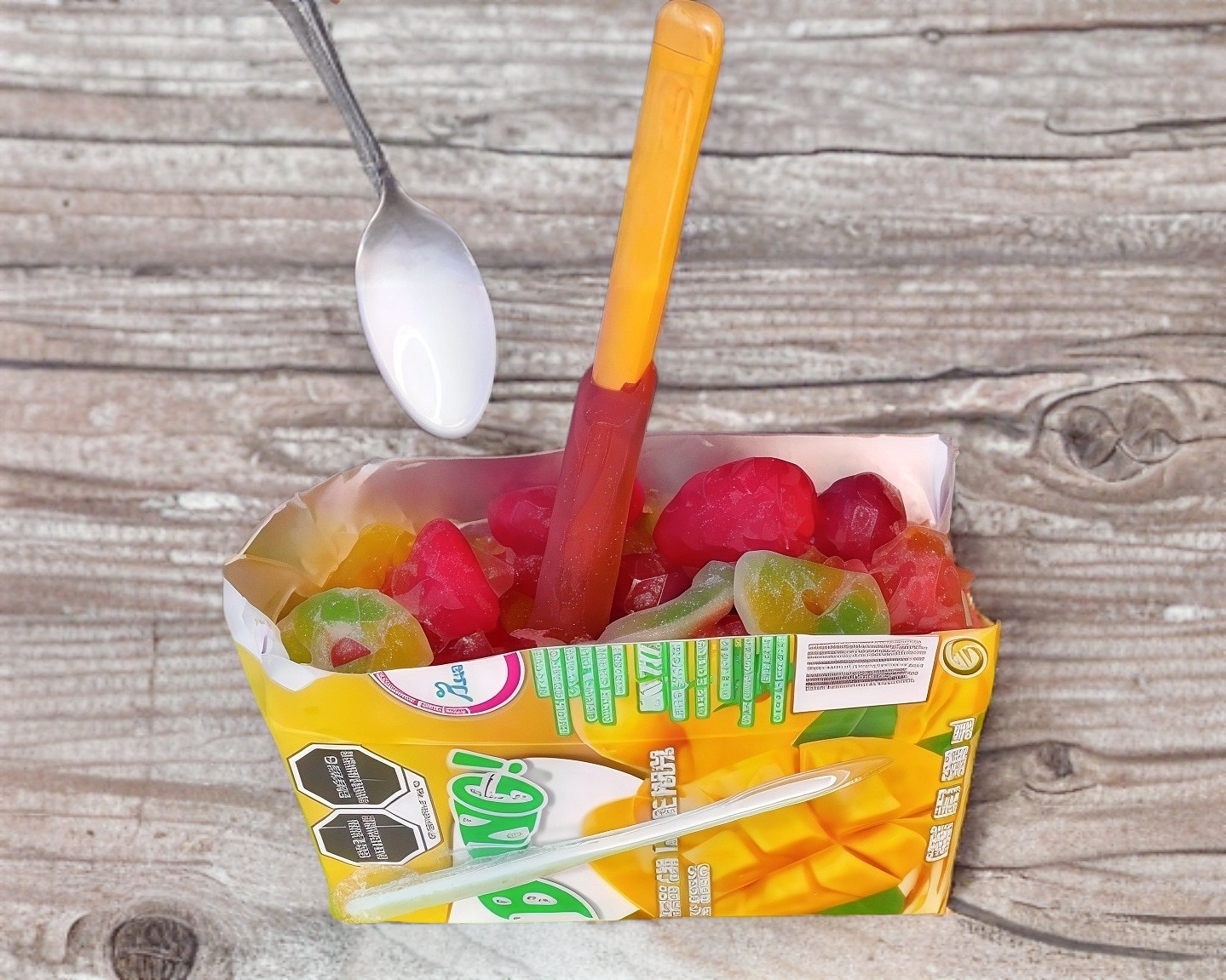 Gomiboing sabor a elegir uva, mango, fresa, manzana, guayaba y naranja lleva los siguientes ingredientes a elegir chamoy Miguelito Tajín y gomitas