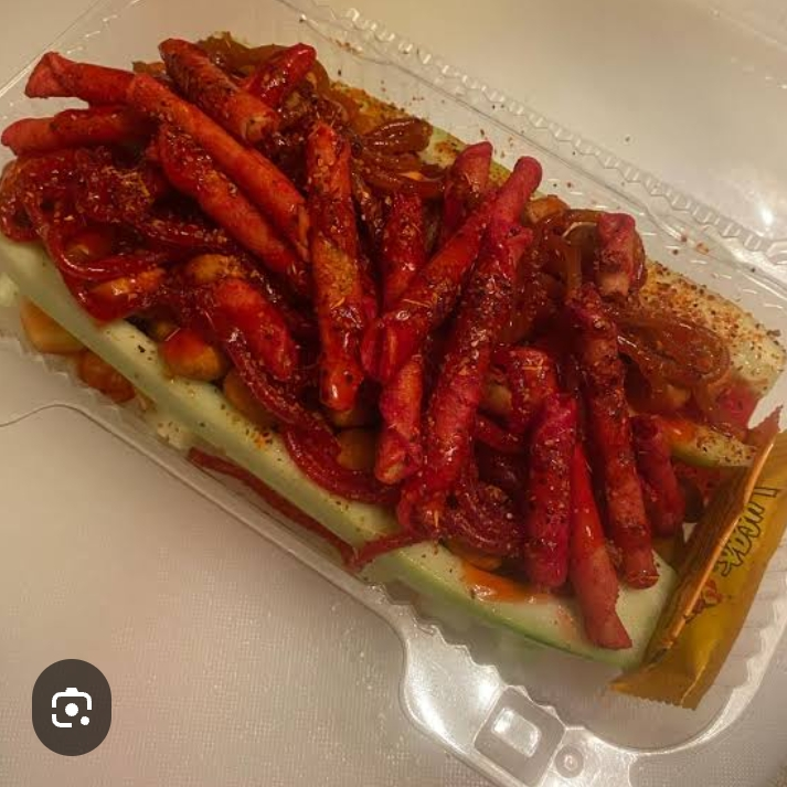 Pepinos acompñados de cueritos cacahuate chamoy tajon y salsa