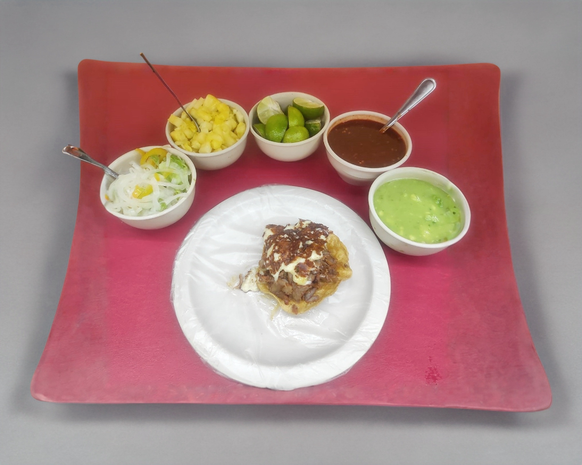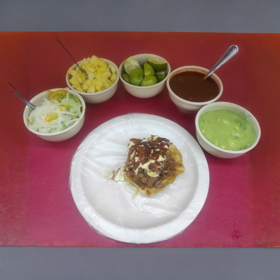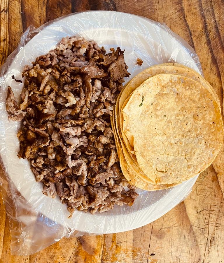 1 pieza de taco con 120 gr aprox. carne de suadero acompañado salsa verde, roja, limón