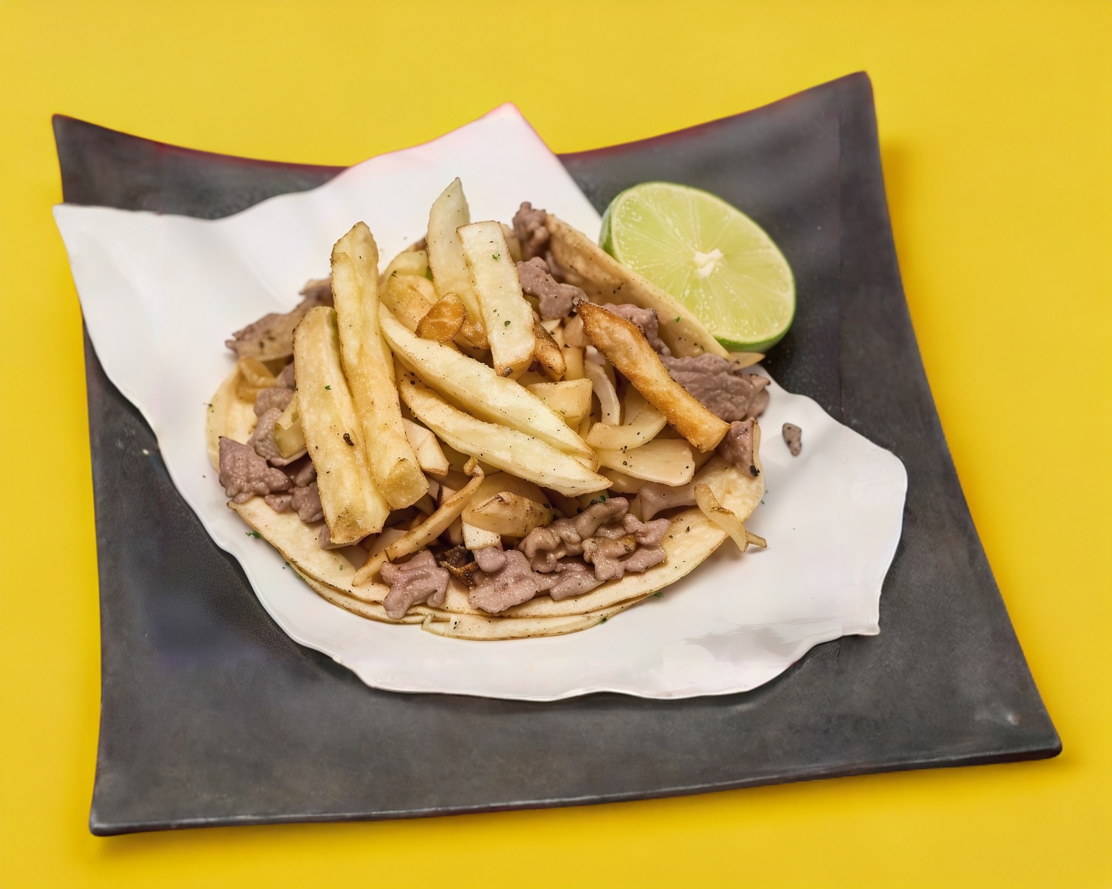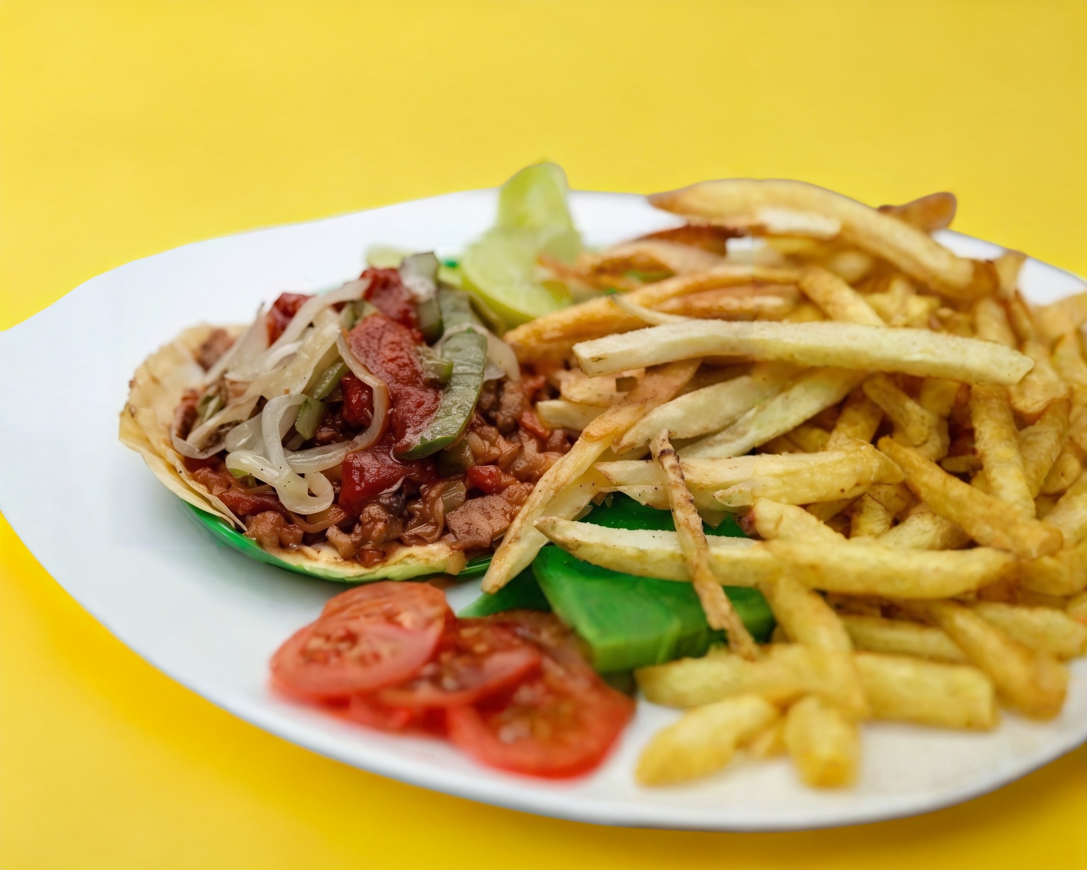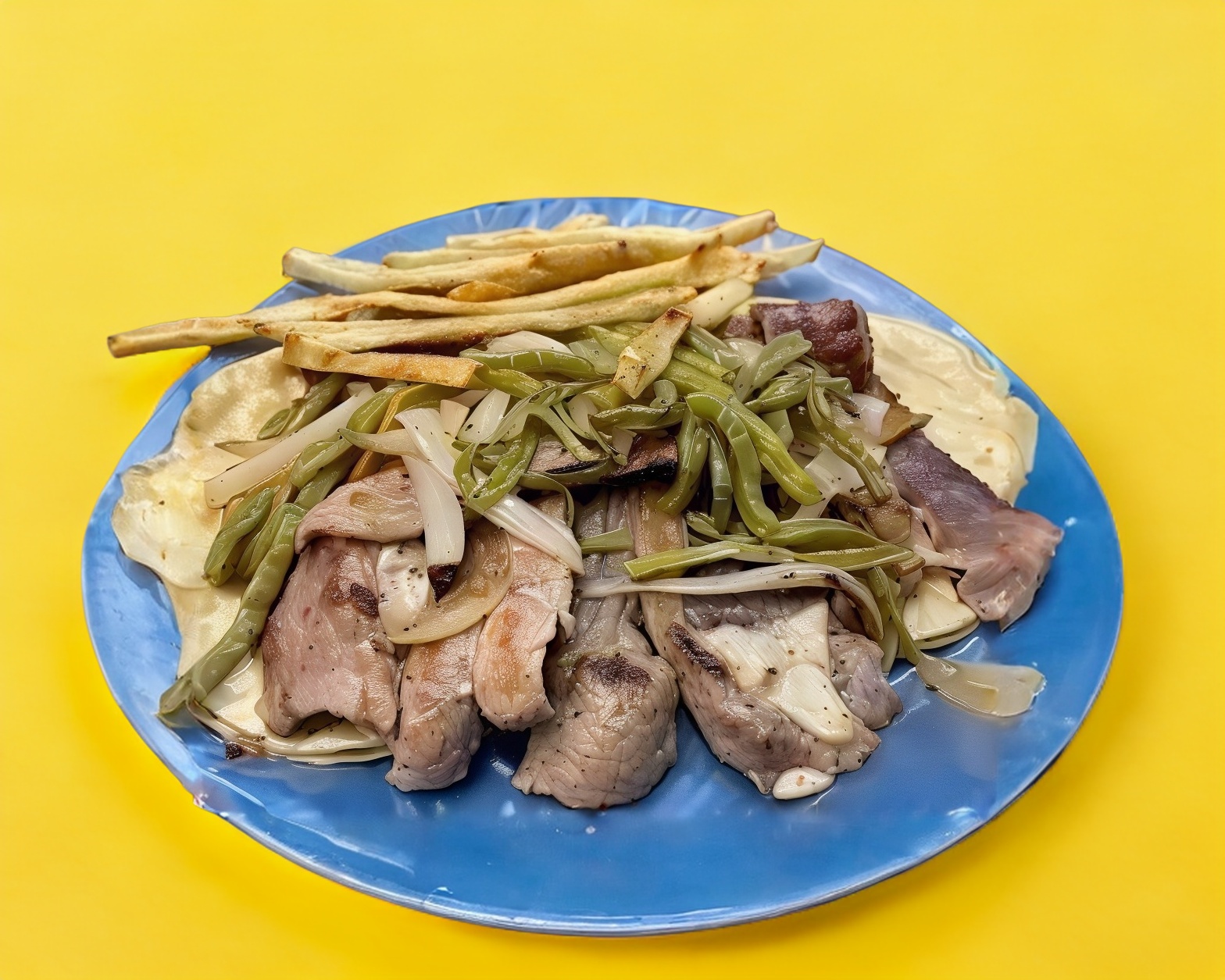 Vienen acompañados de papas a la francesa, cebolla asada, frijoles, napoles, limón, salsa verde y roja.