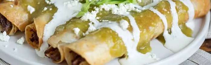 Tres piezas de tacos dorados ahogados en salsa a tu elección, roja o verde, adornados con lechuga, crema, queso, jitomate y cebolla morada.