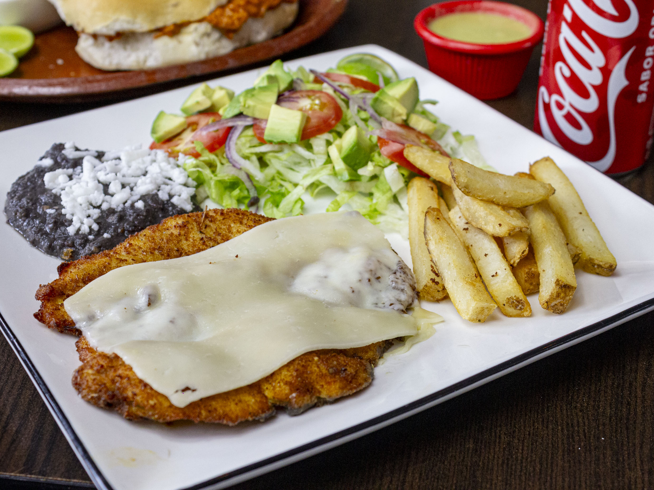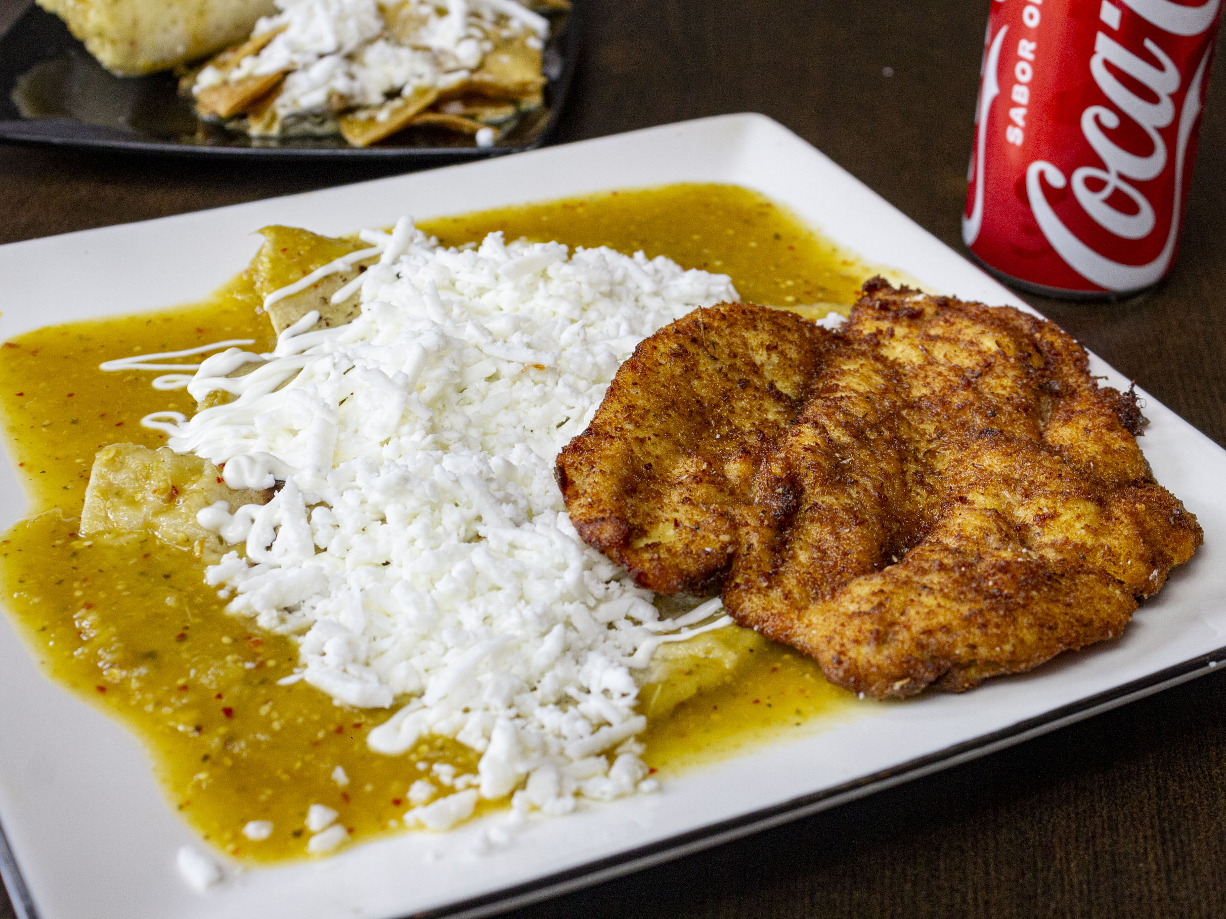Milanesas con 3 piezas de enchiladas verdes o rojas con queso, crema y cebolla.