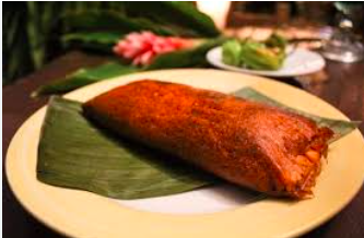 Tamal salado envuelto en hoja de plátano, relleno de carne de puerco y salsa verde.