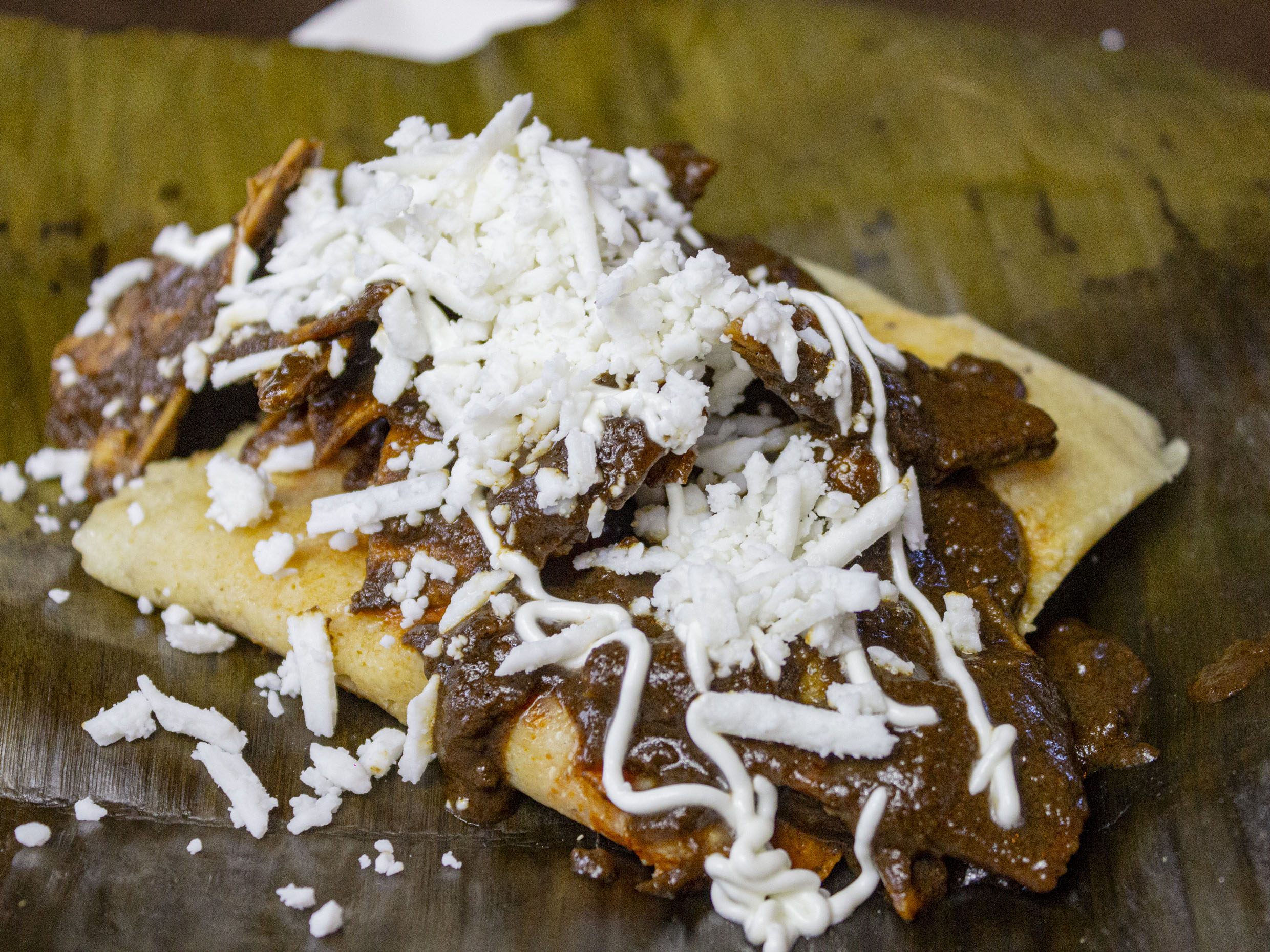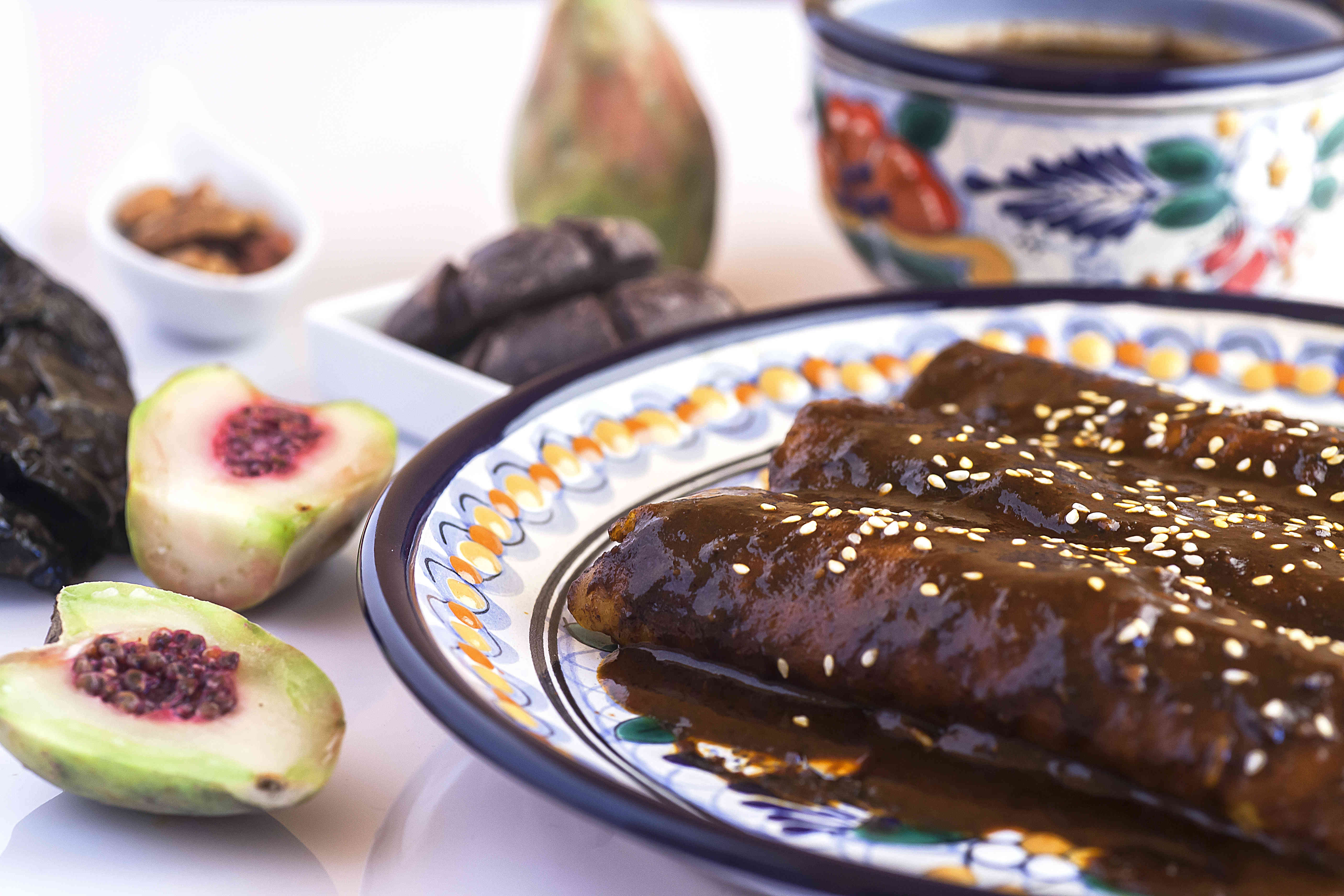 Tres piezas de mole poblano con pollo, queso y crema.