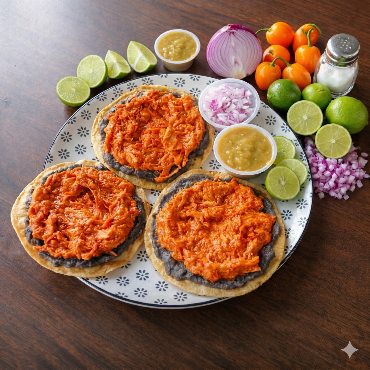 Tres tostadas de tamaño normal con frijoles y cochinita pibil. Acompañados de cebollita morada salsa habanero y jugosos limones.