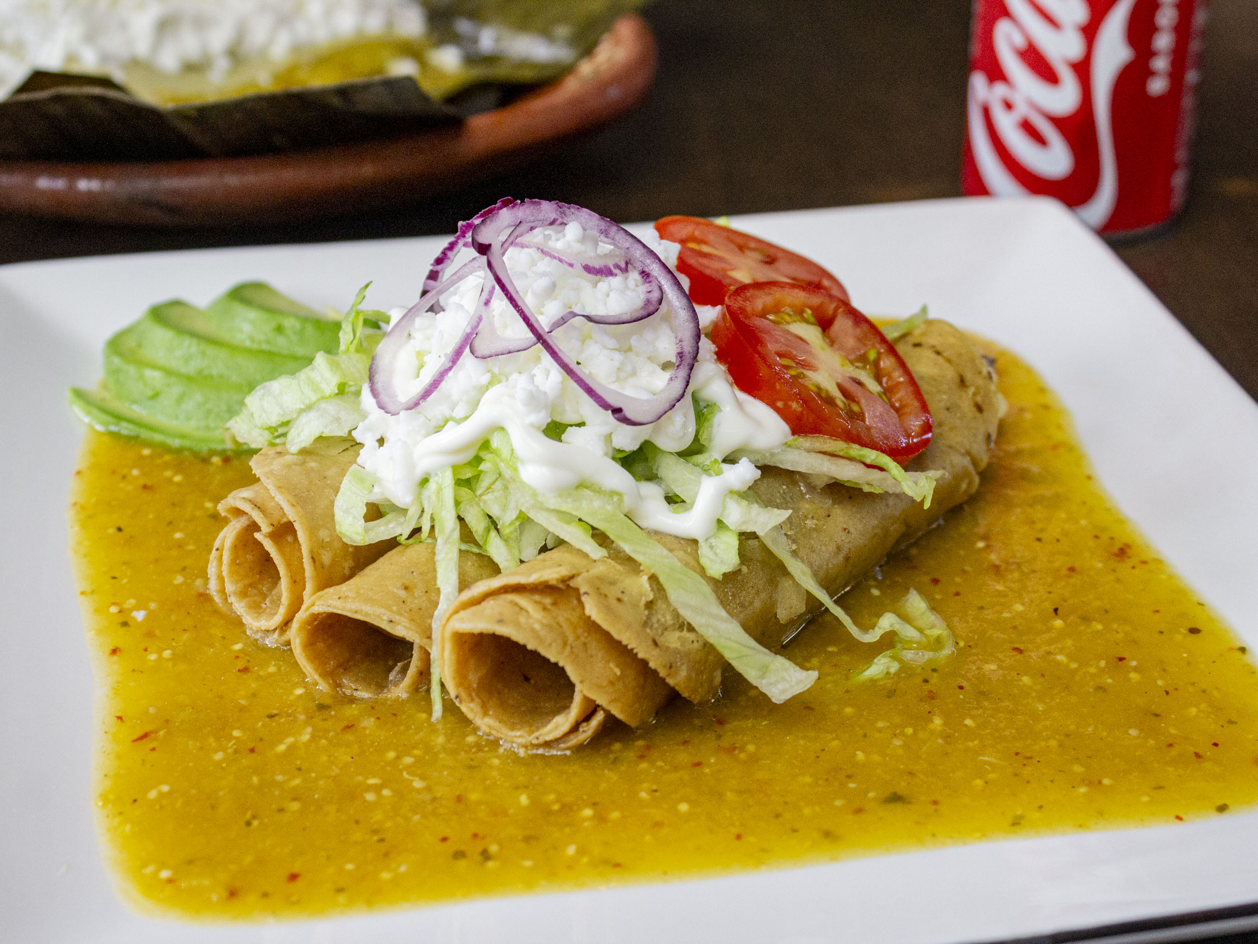 3 crujientes flautas con crema , lechuga, jitomate y cebolla.