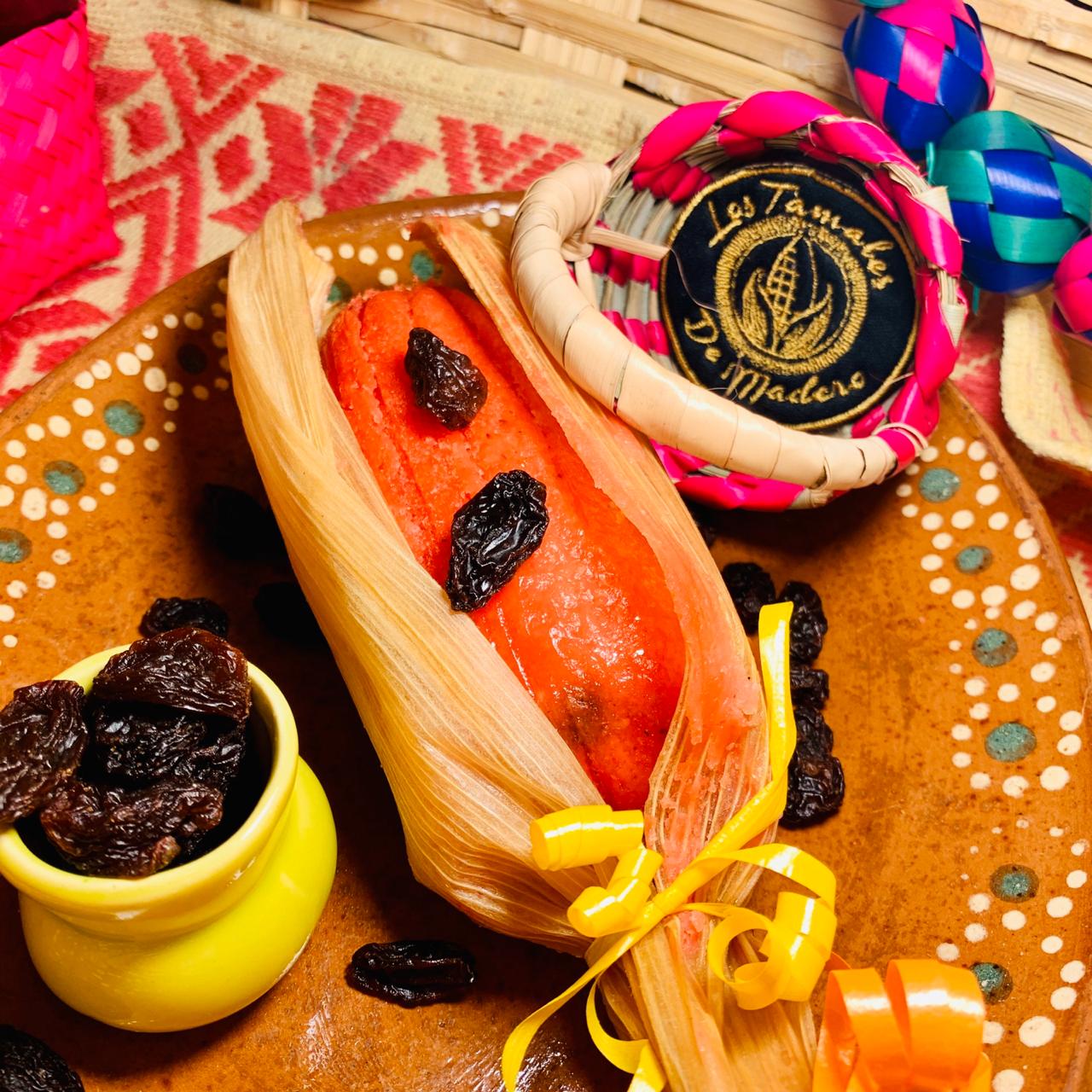 El tradicional tamal rosa con pasas.