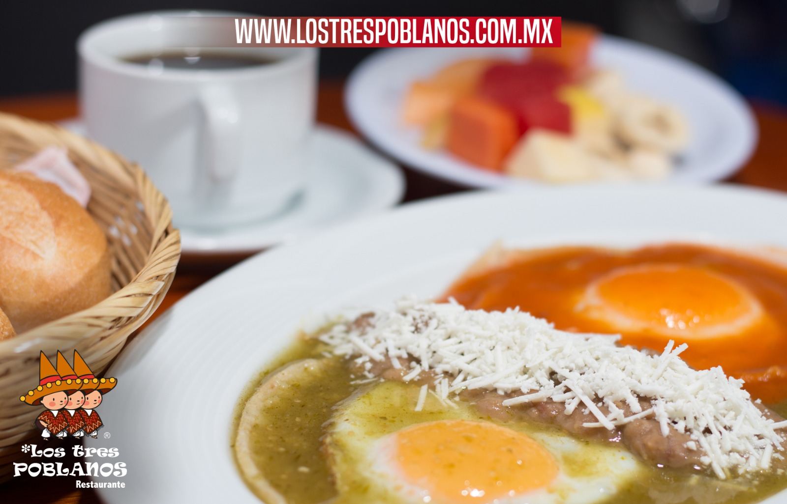 Totopos bañados en salsa verde o roja, crema, queso y cebolla; servidos con dos huevos al gusto y frijoles refritos.