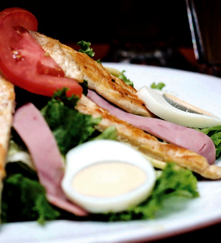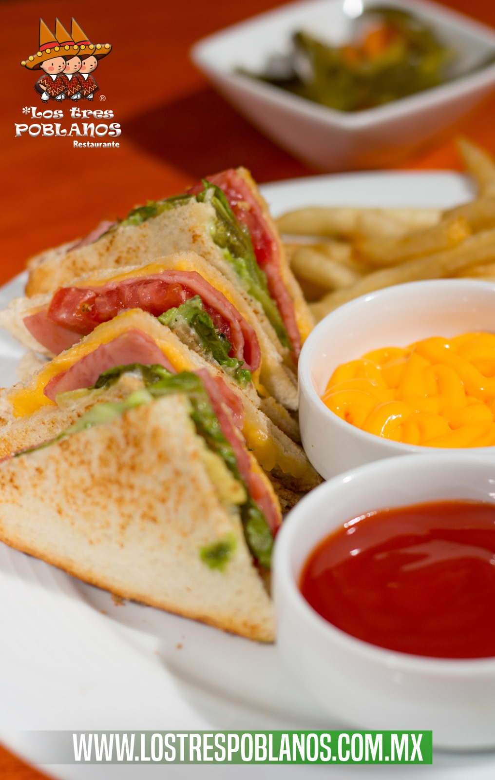 Pan blanco con rebanadas de jamón y queso americano, jitomate, lechuga, mayonesa y aguacate