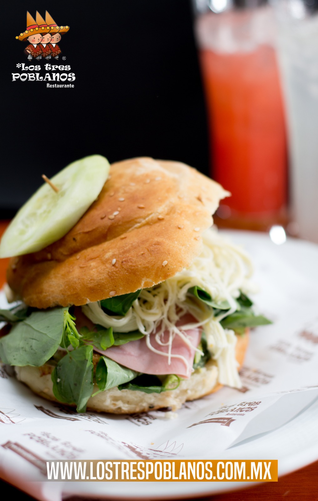 Pan con ajonjolí de milanesa de res con queso oaxaca, jamón, aguacate, cebolla, pápalo y chipotle.