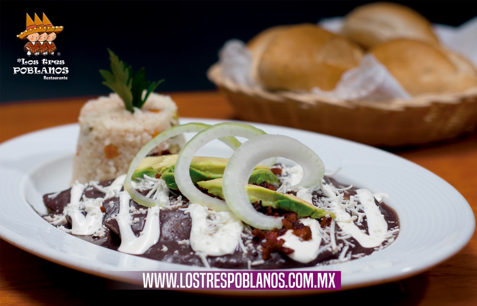 Tortilla de maíz rellena de pollo, bañadas con el mole de la casa. Servidas con crema, queso, cebolla, cilantro y guarnición de arroz.