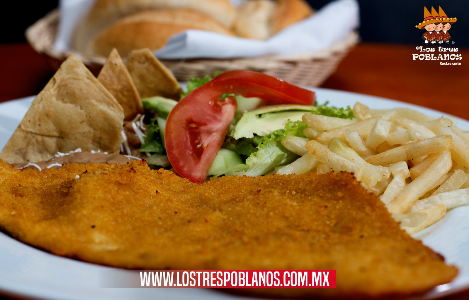 Suculenta pechuga de pollo empanizado acompañada de 2 guarniciones de su elección.